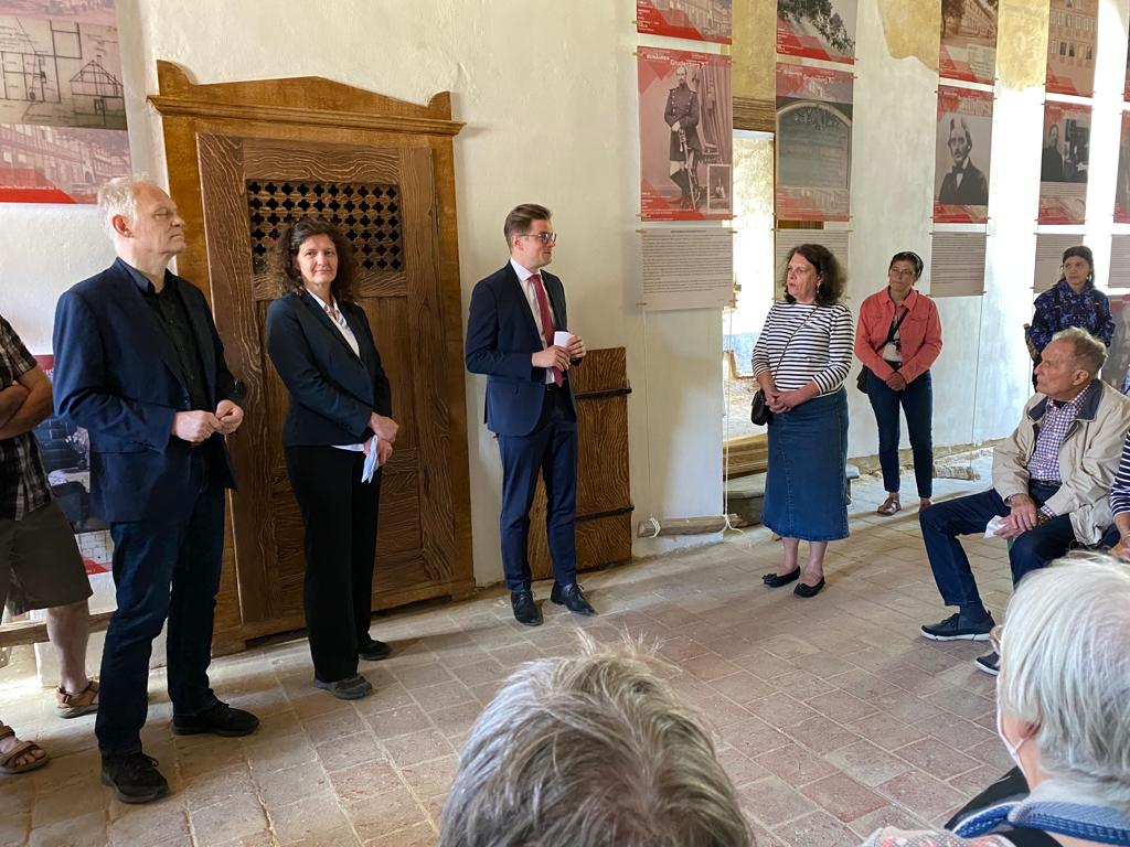 Besucher und Mitarbeiter des Fachwerkzentrums im Gespräch mit Staatssekretär Herrn Haller, Ministerium für Infrastruktur und Digitales Land S-A