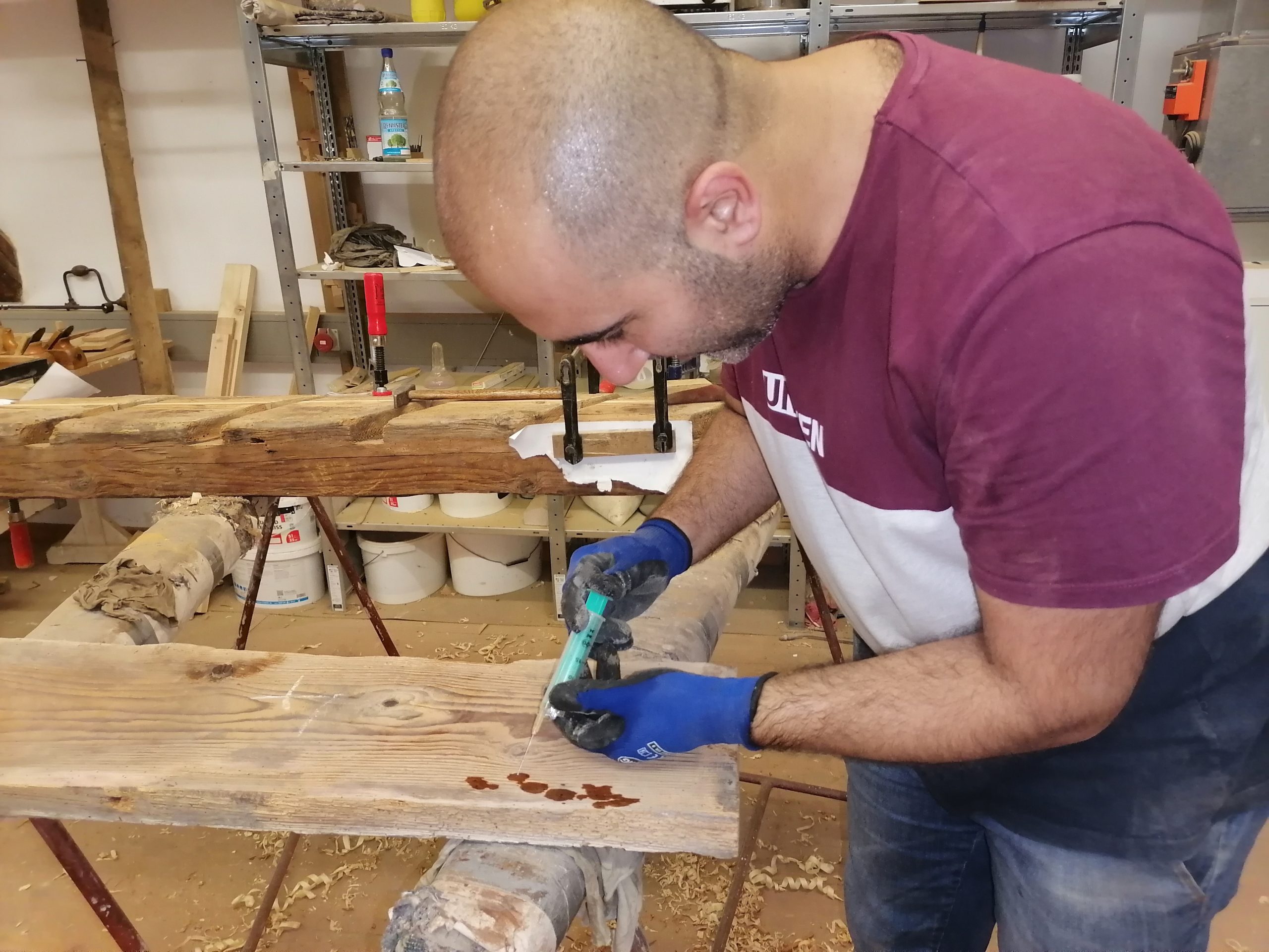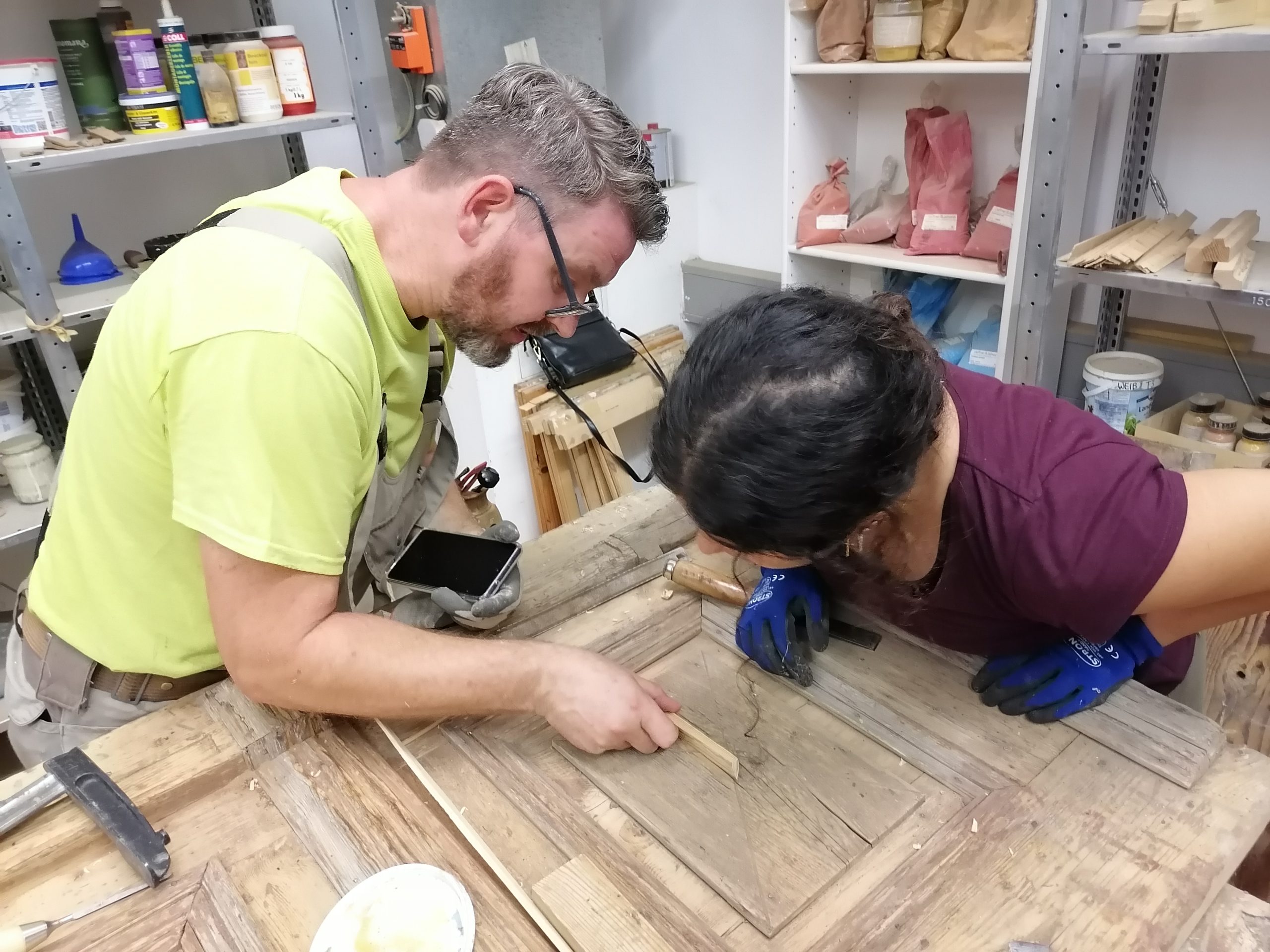 - an der Restaurierung einer Tür und einer Treppe der Renaissance – hier das Aussetzen geschädigter Bereiche mit Holz- und Knochenleim.