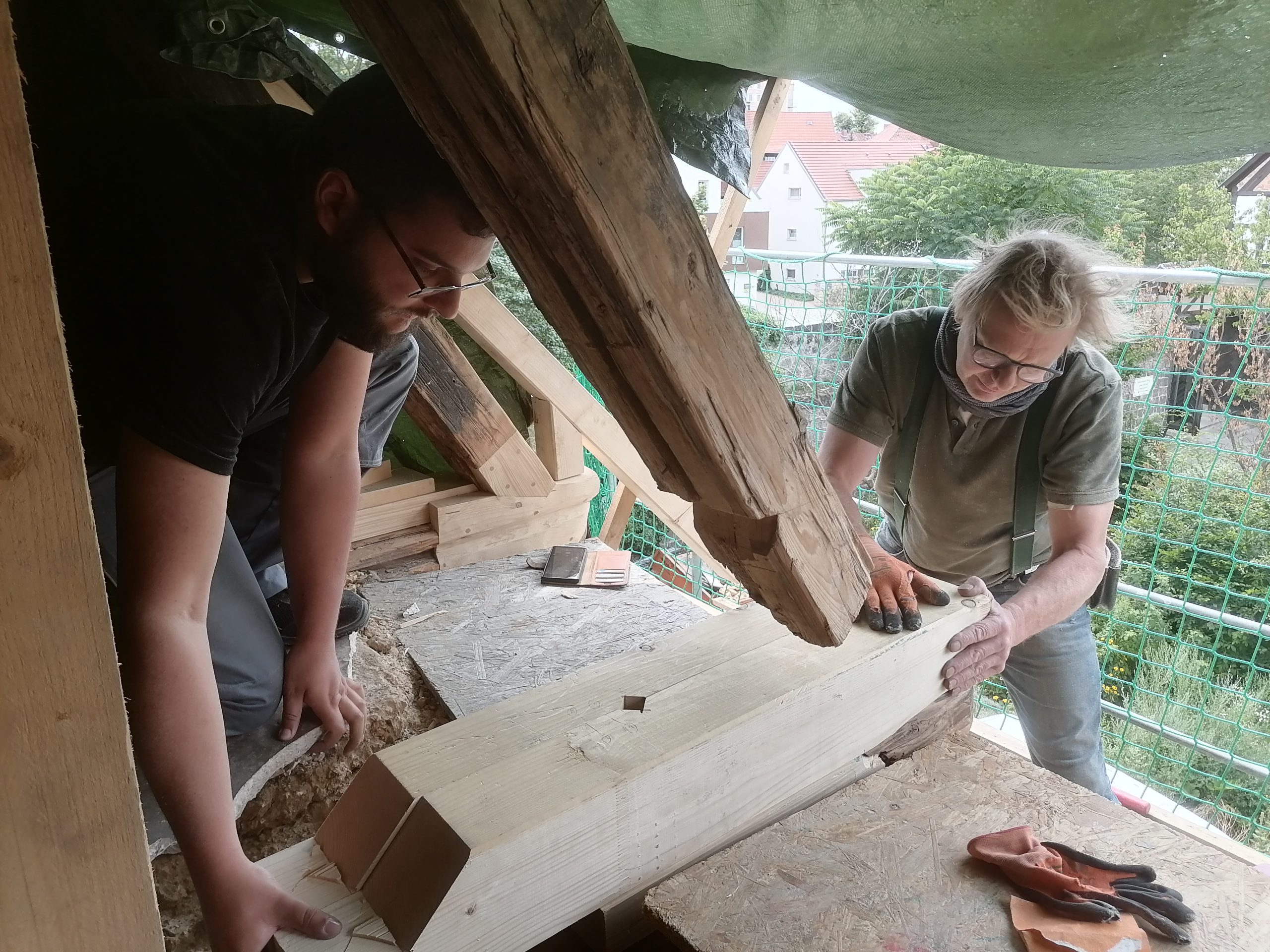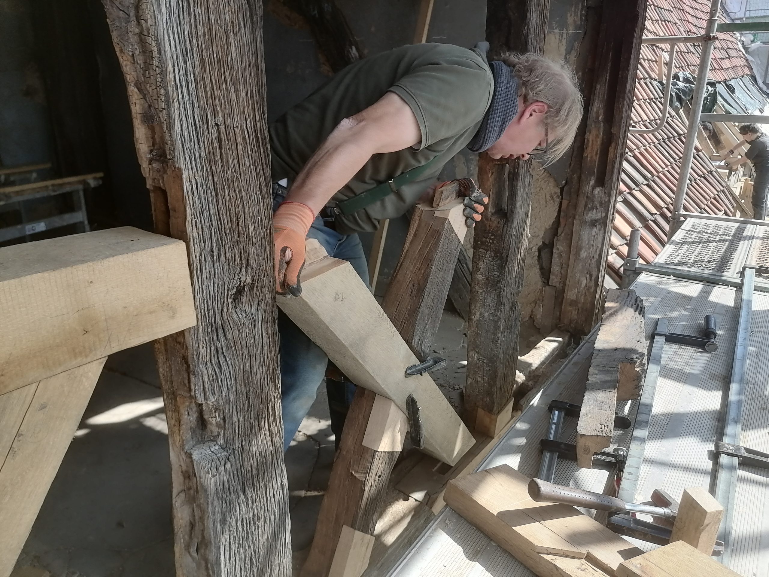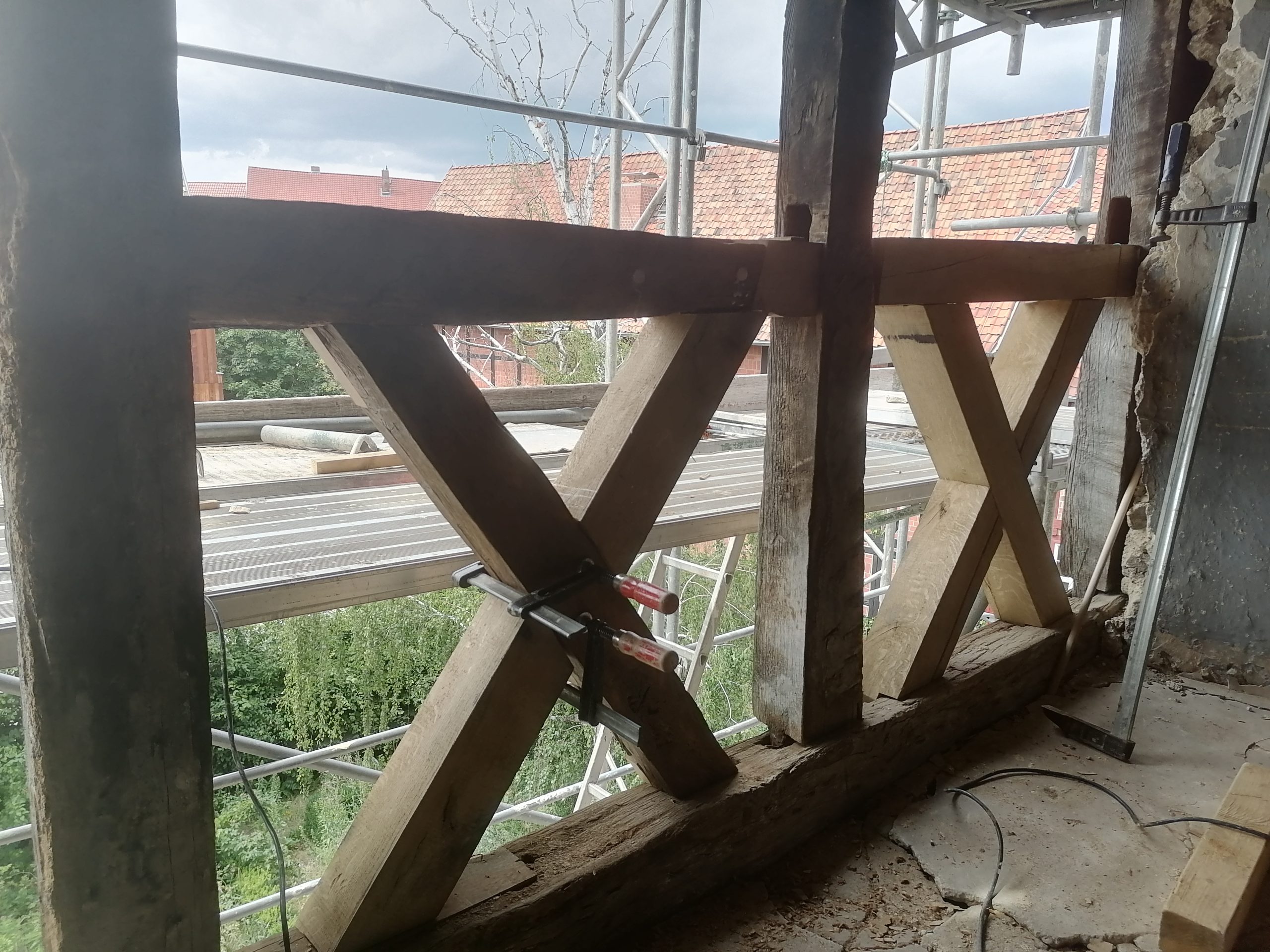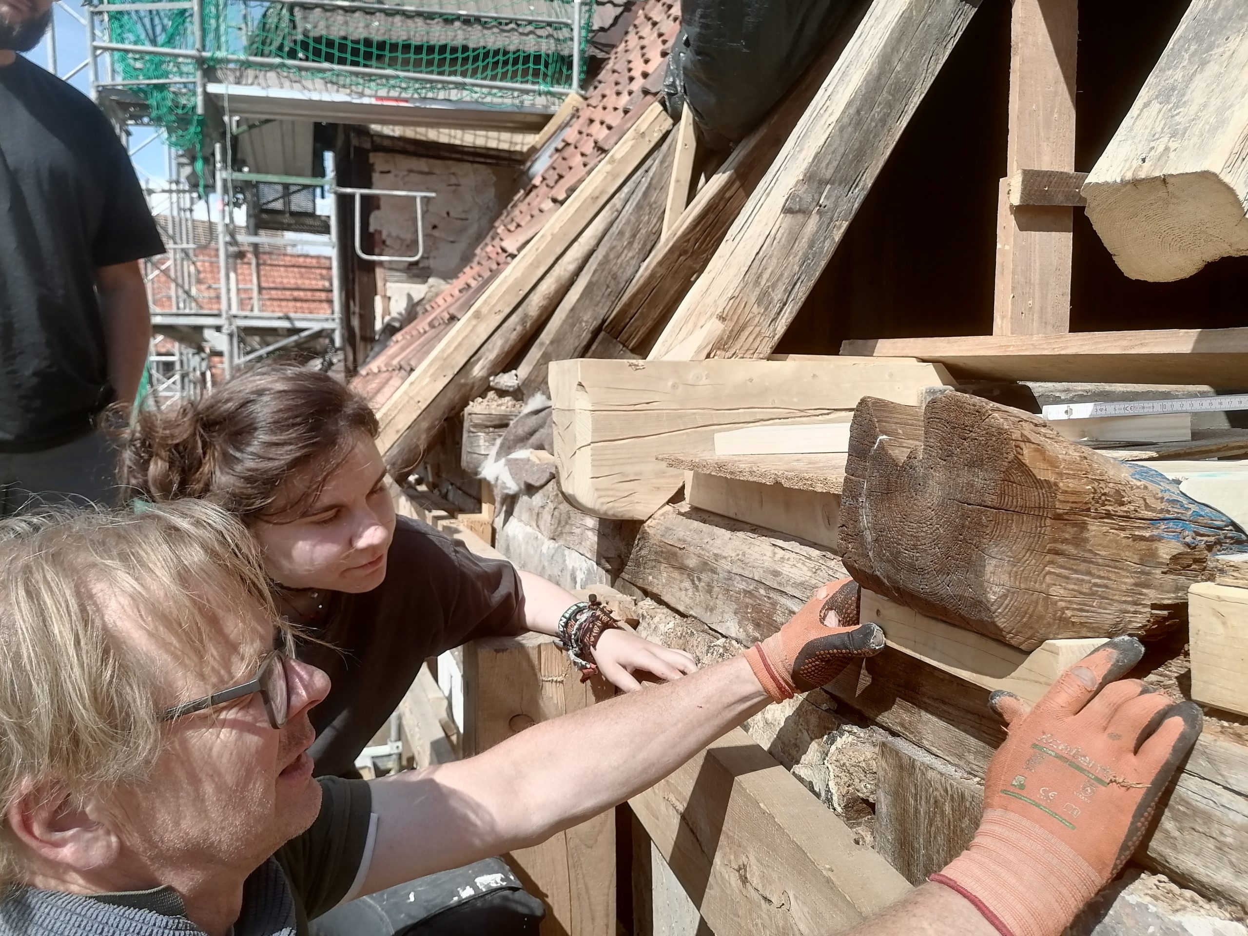 Die Student:innen restaurierten mit ihrem Anleitern die Fachwerkkonstruktion – hier das nordwestliche Zwerchhaus – der Renaissance .