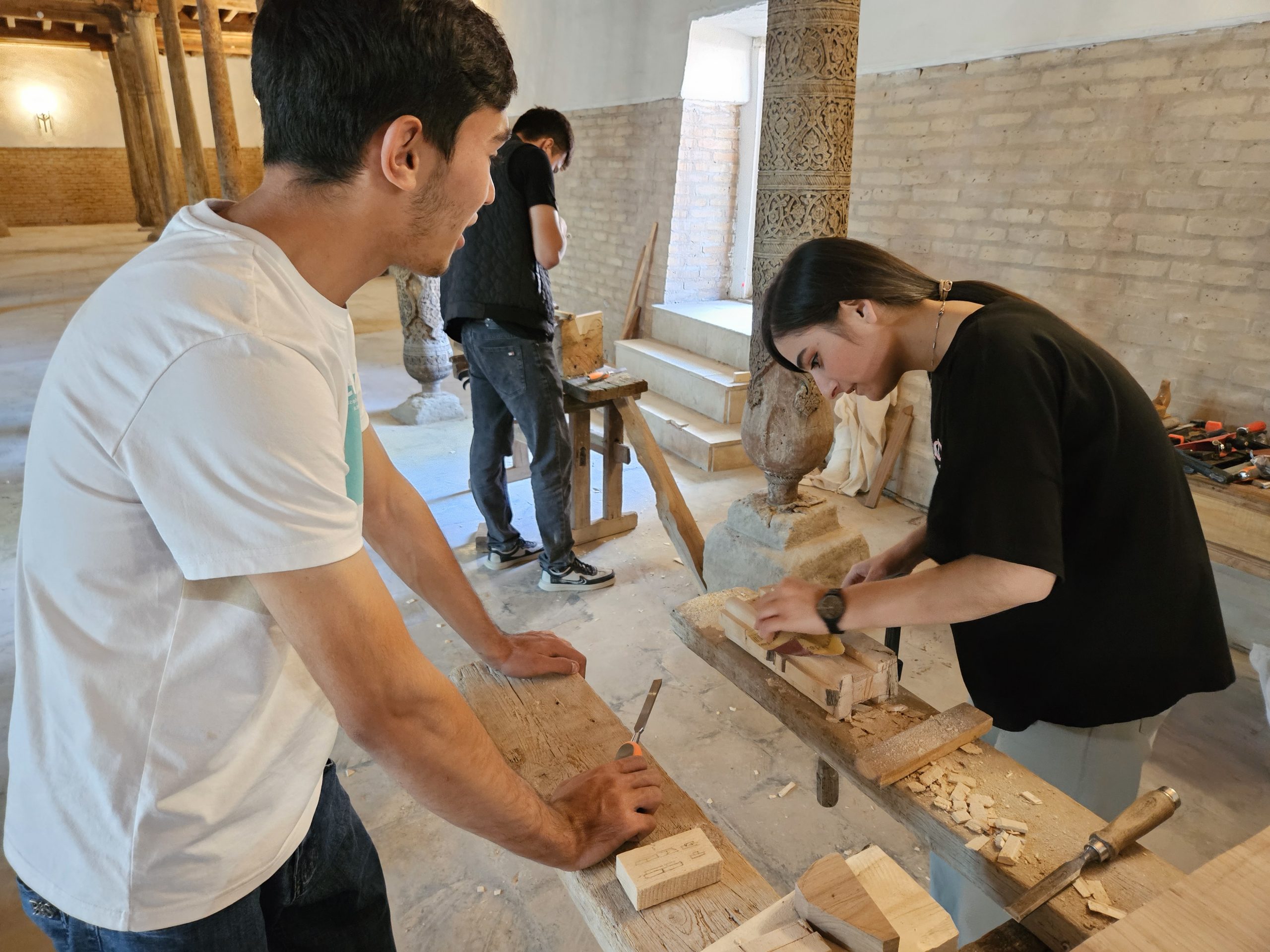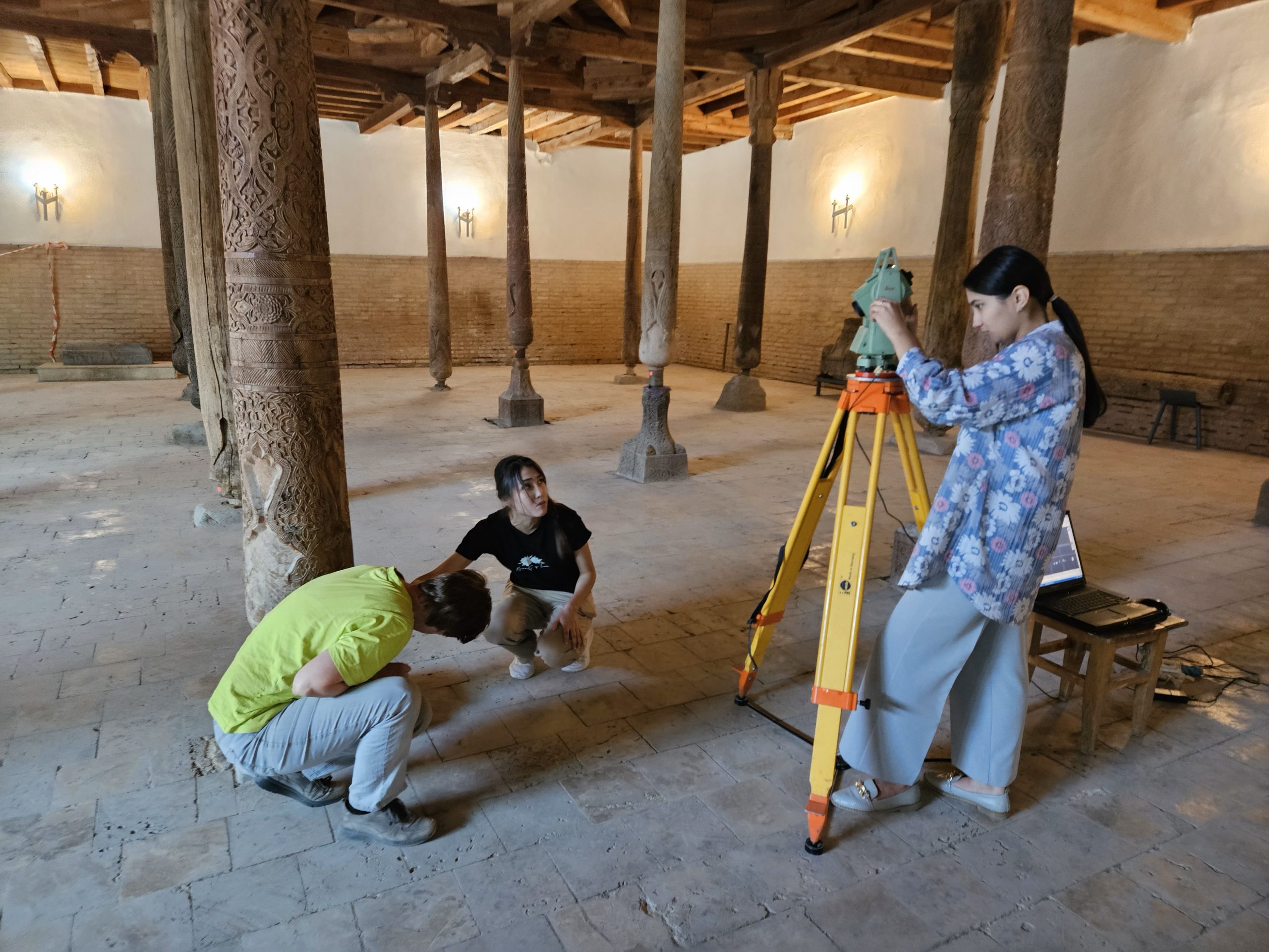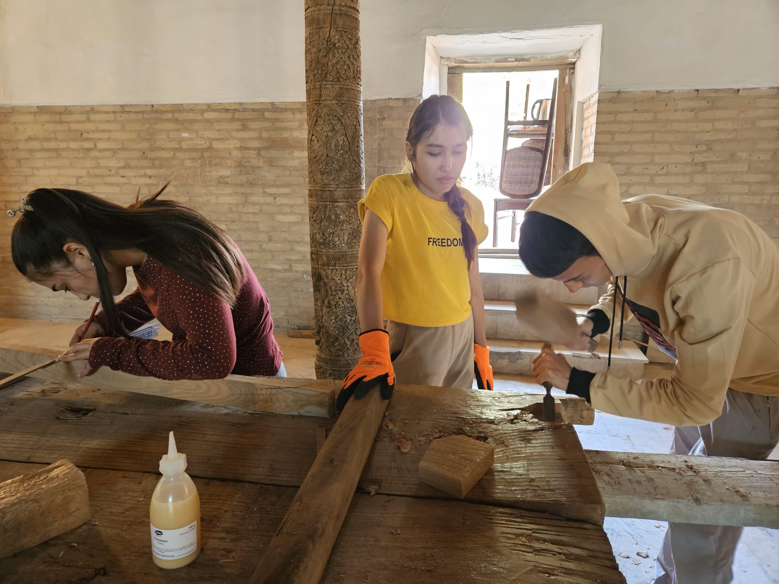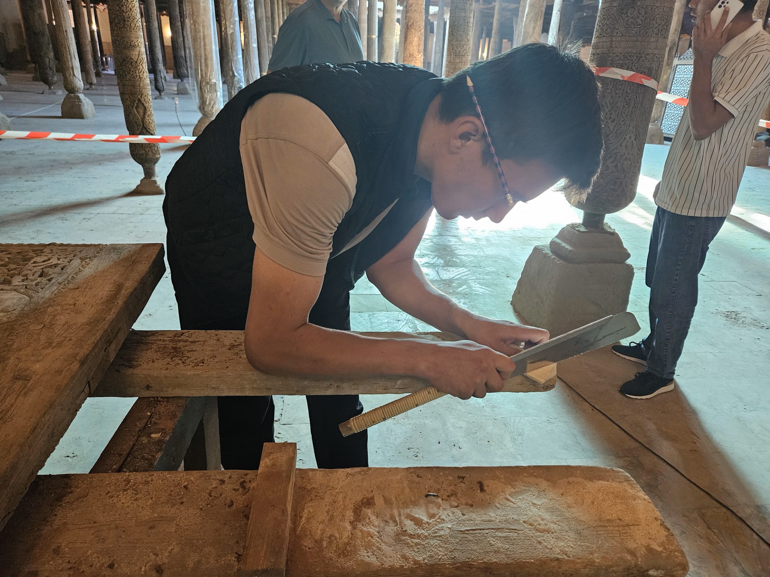 The second working group restores the historical columns and dragon-shaped saddle beams connected to the ceiling structure in the Juma Masjid in Khiva. Missing parts are supplemented, and cracks are closed by using inserts.