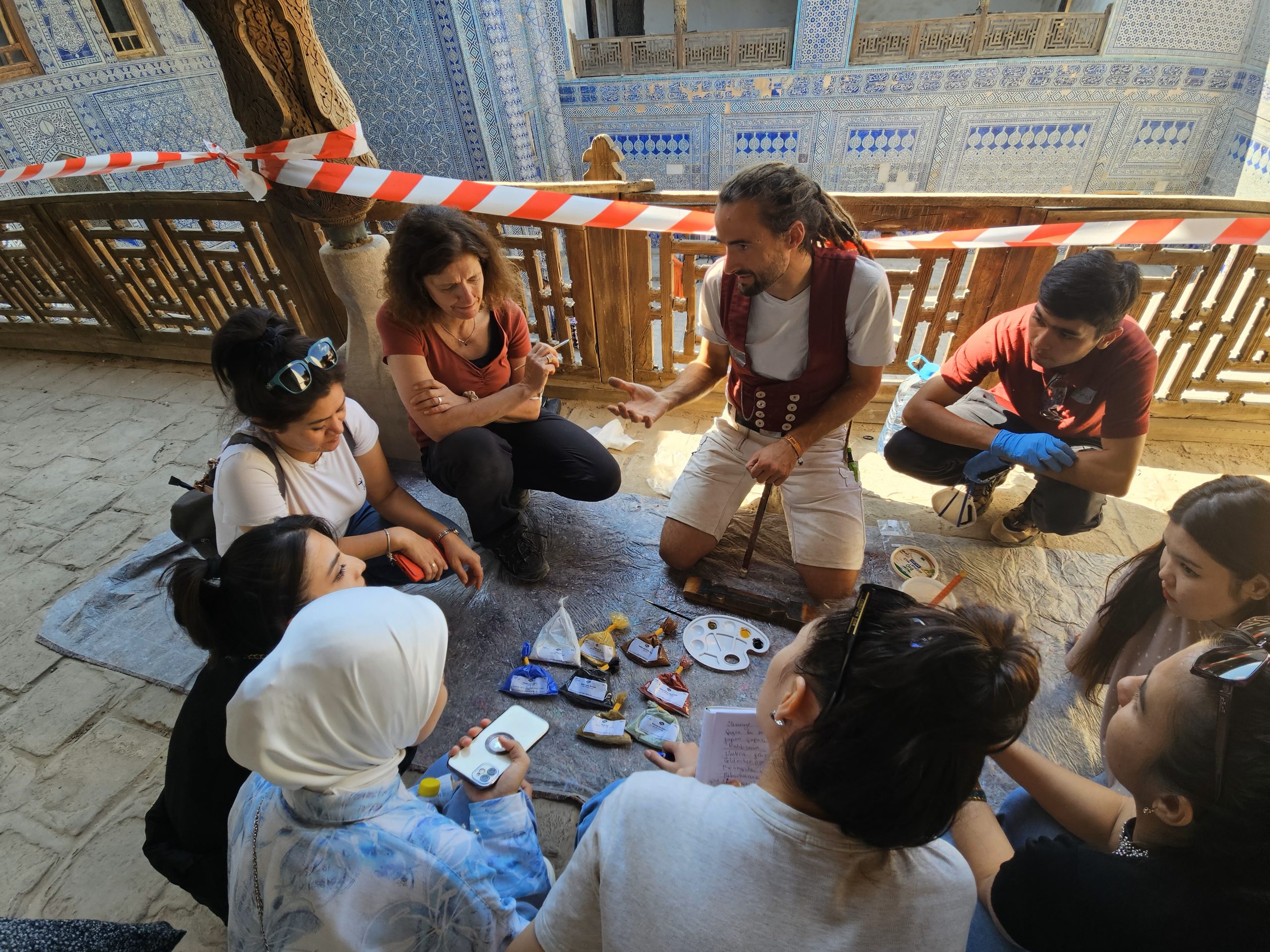 EN: Restoration with the students of the Urgench State University of the historic ceiling painting in the Tash Hauli Palace Chiva formed the careful retouching of the defects of the painting.