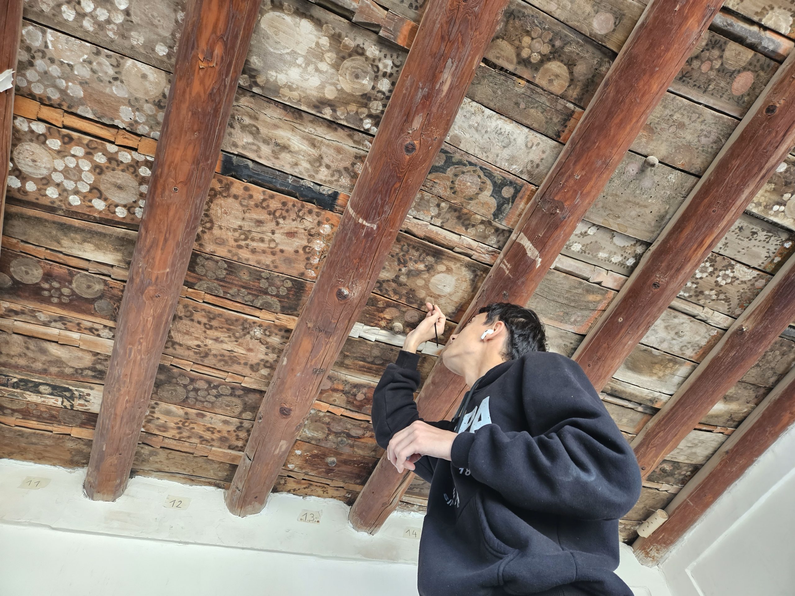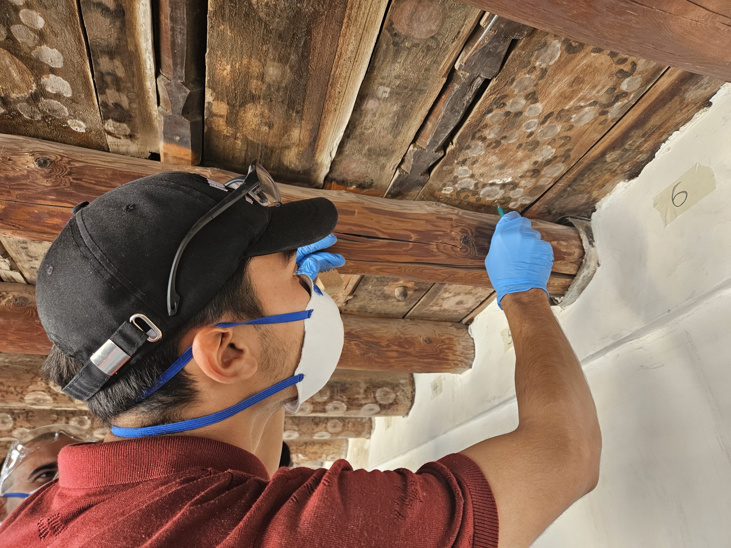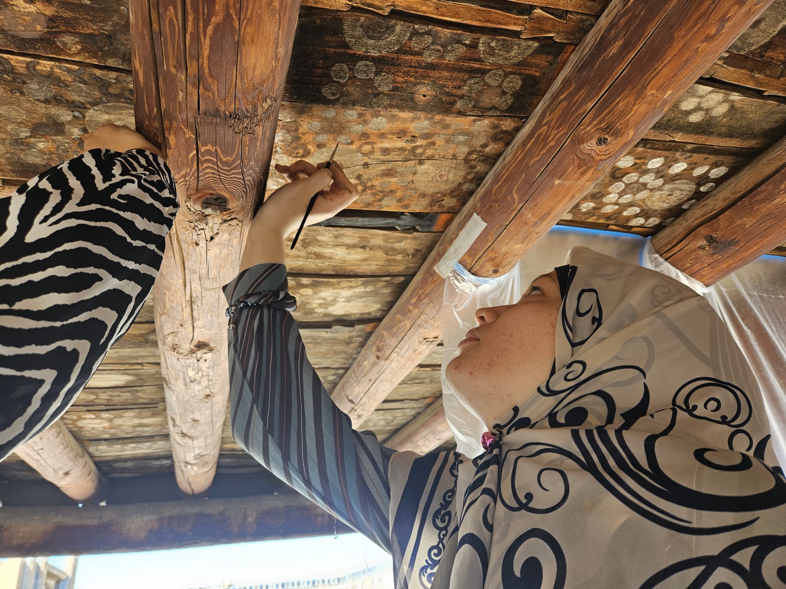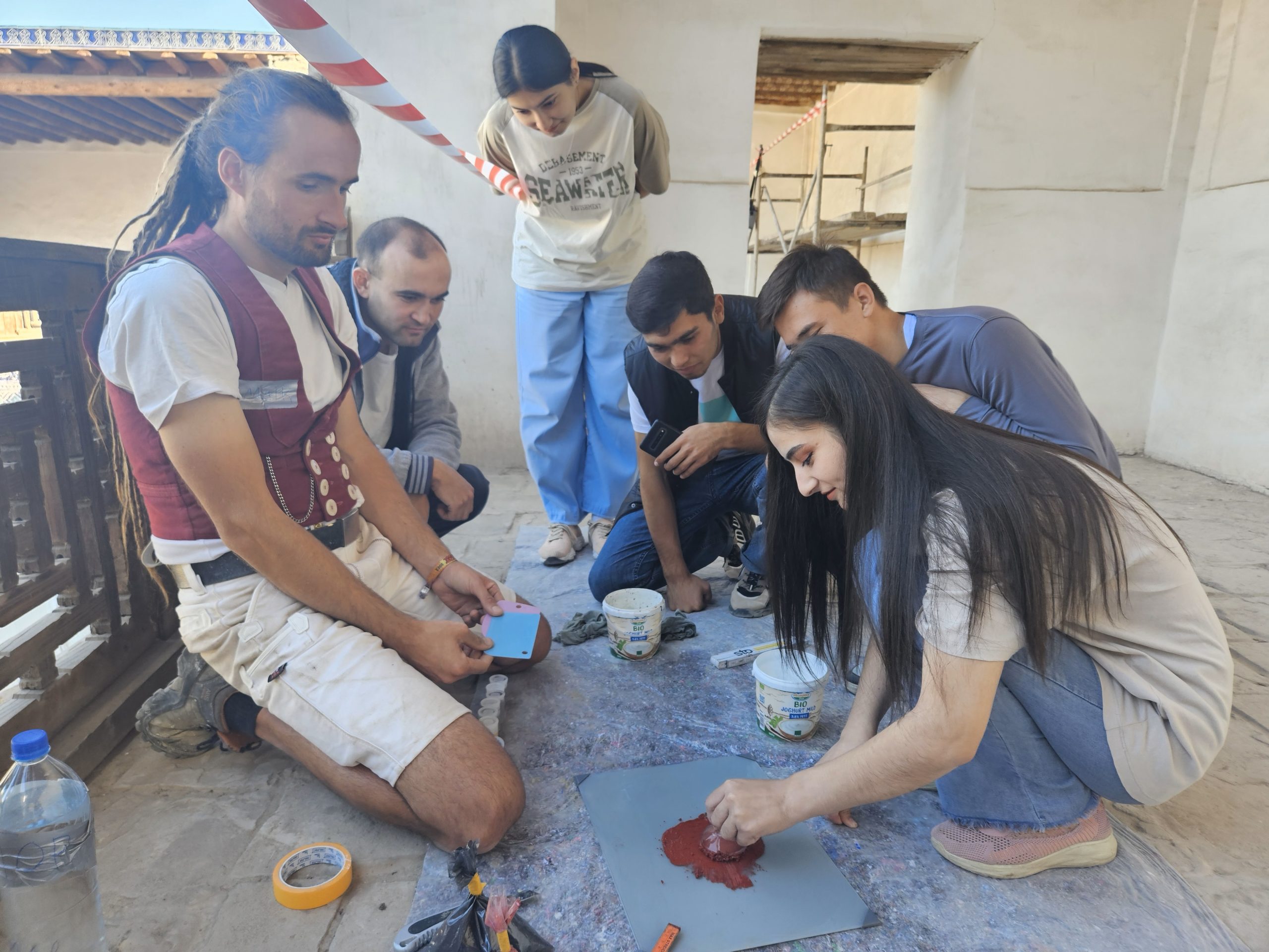 DE: Restaurierung mit den Student:innen der Urgench State University der historischen Deckenmalerei im Tash Hauli Palace Chiva bildete die behutsame Retusche von Fehlstellen der Malerei.