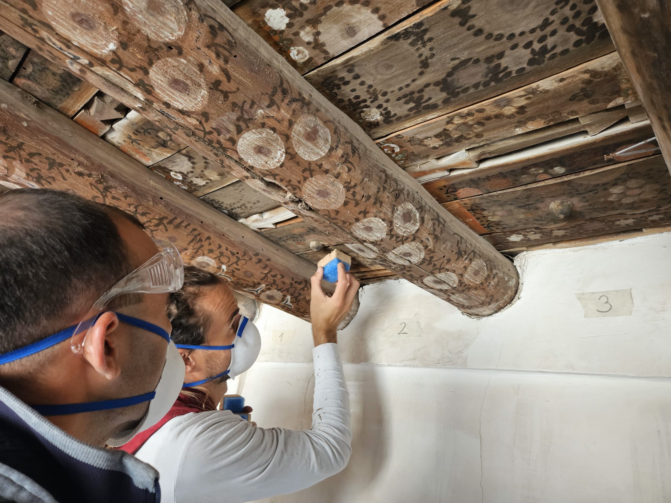 Die erste Arbeitsgruppe ist in der Restaurierung der Deckenmalerei im Tash Hauli Palast, wie vor 200 Jahren: Der erste Arbeitsschritt der Restaurierung der historischen Deckenmalerei ist die behutsame Reinigung und Rückfestigung der Malerei. Im 2. Arbeitsschritt folgt die behutsame Retusche von Fehlstellen in der Malerei.