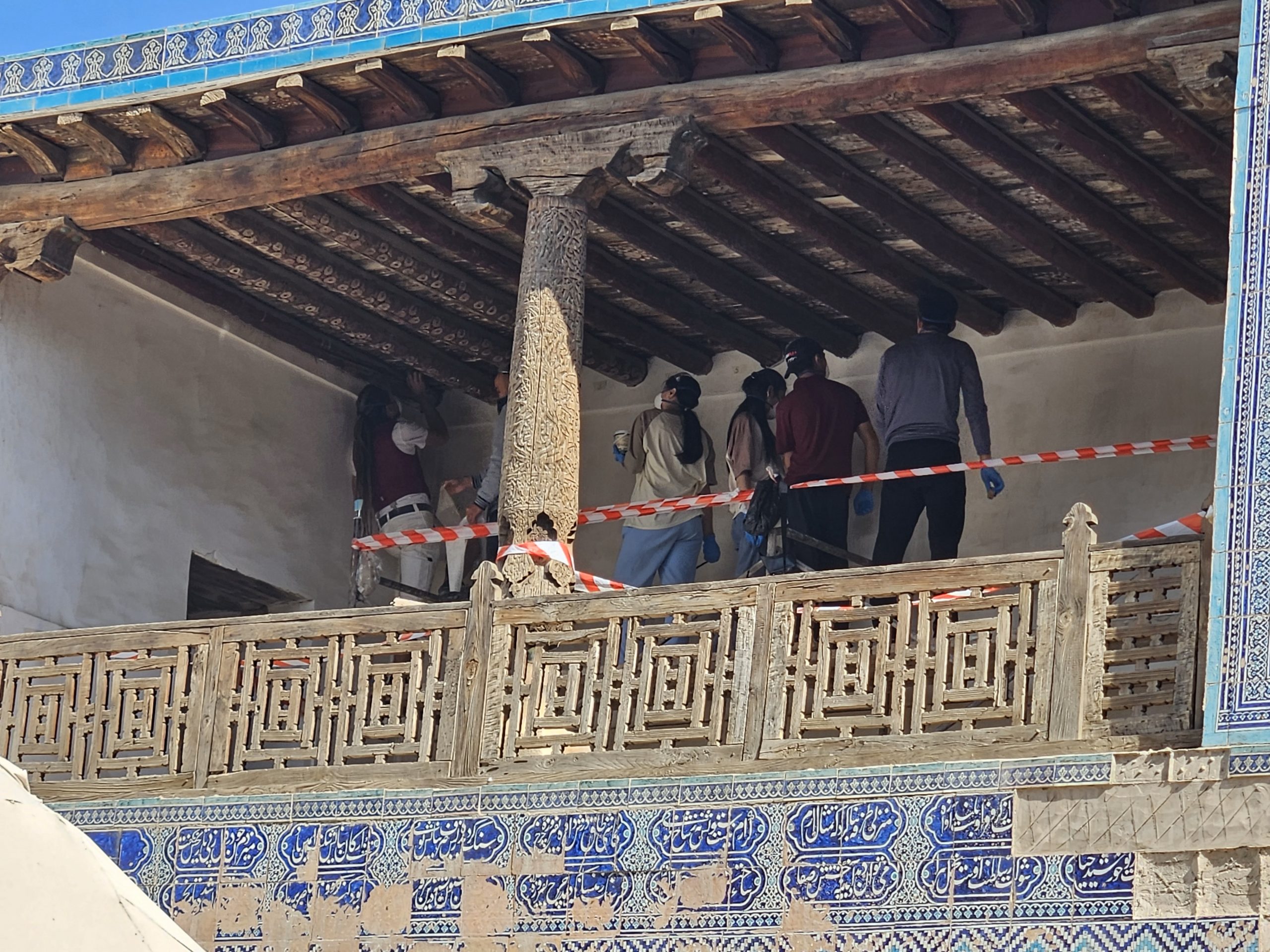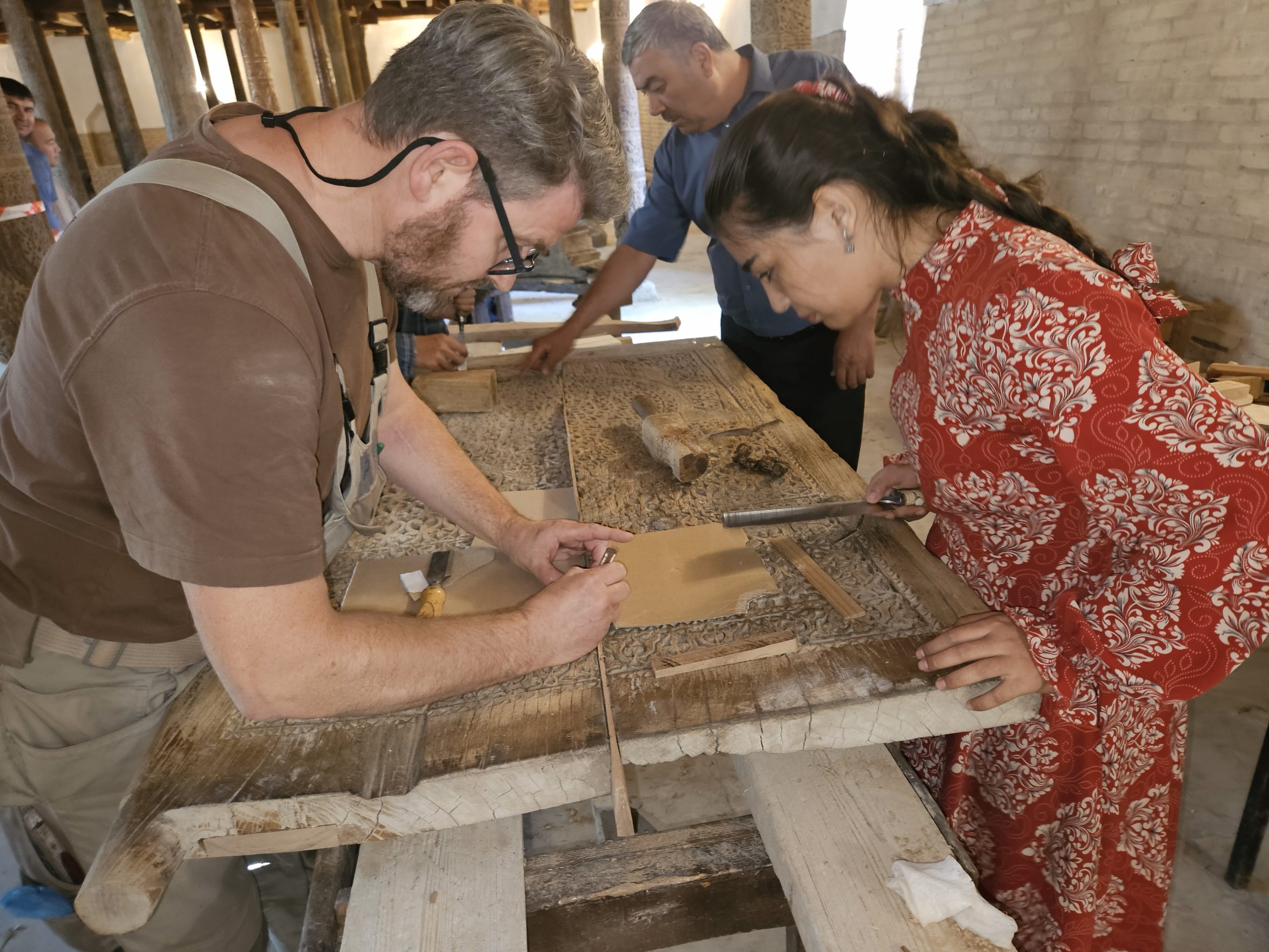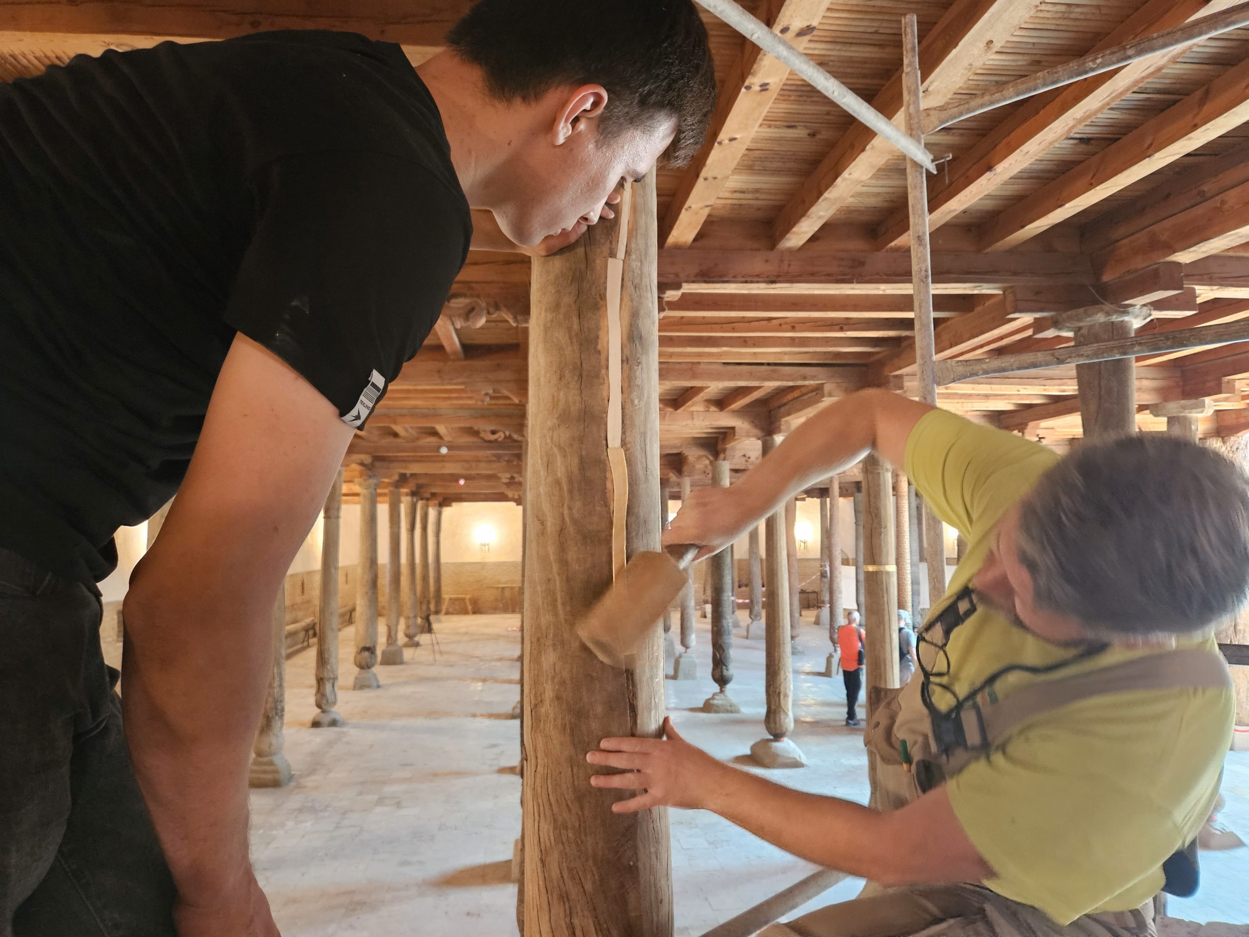 Die zweite Arbeitsgruppe restauriert die historischen Säulen und Sattelhölzer in Drachenform, verbunden mit der Deckenkonstruktion in der Juma Masjid in Chiwa. Fehlstellen werden ergänzt, Risse mittels Aussetzungen geschlossen.