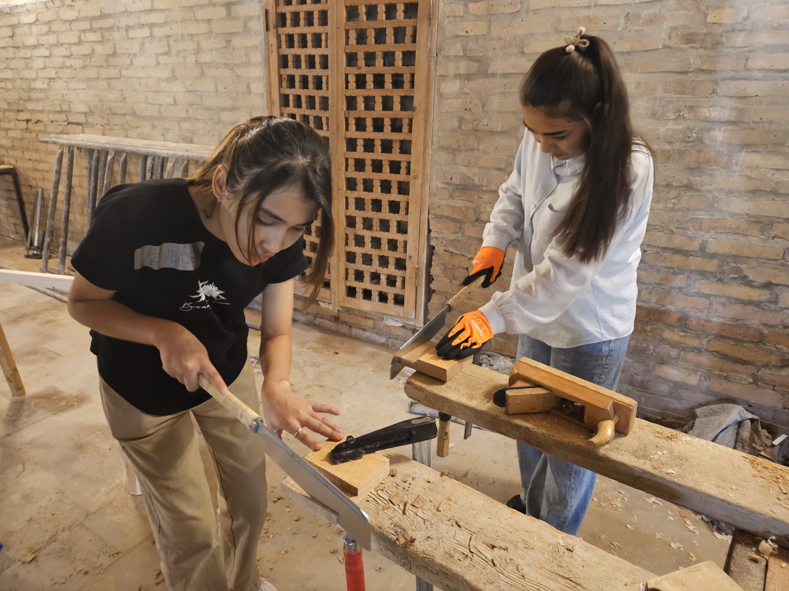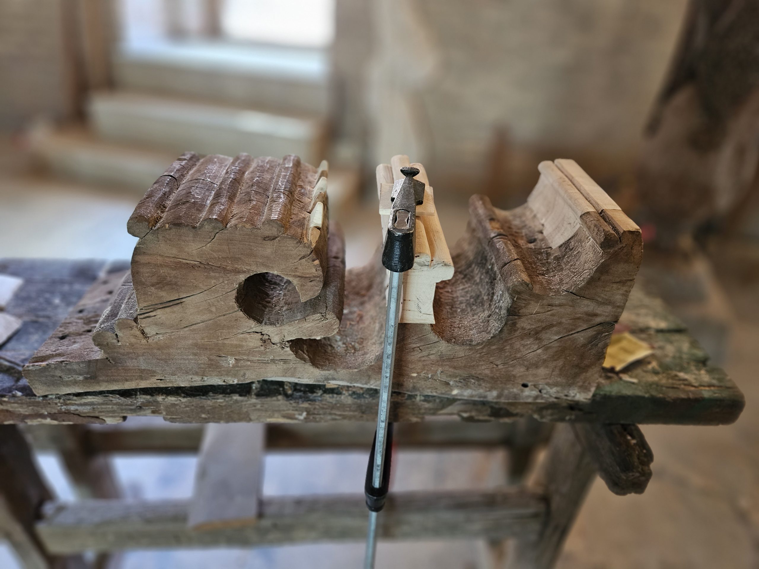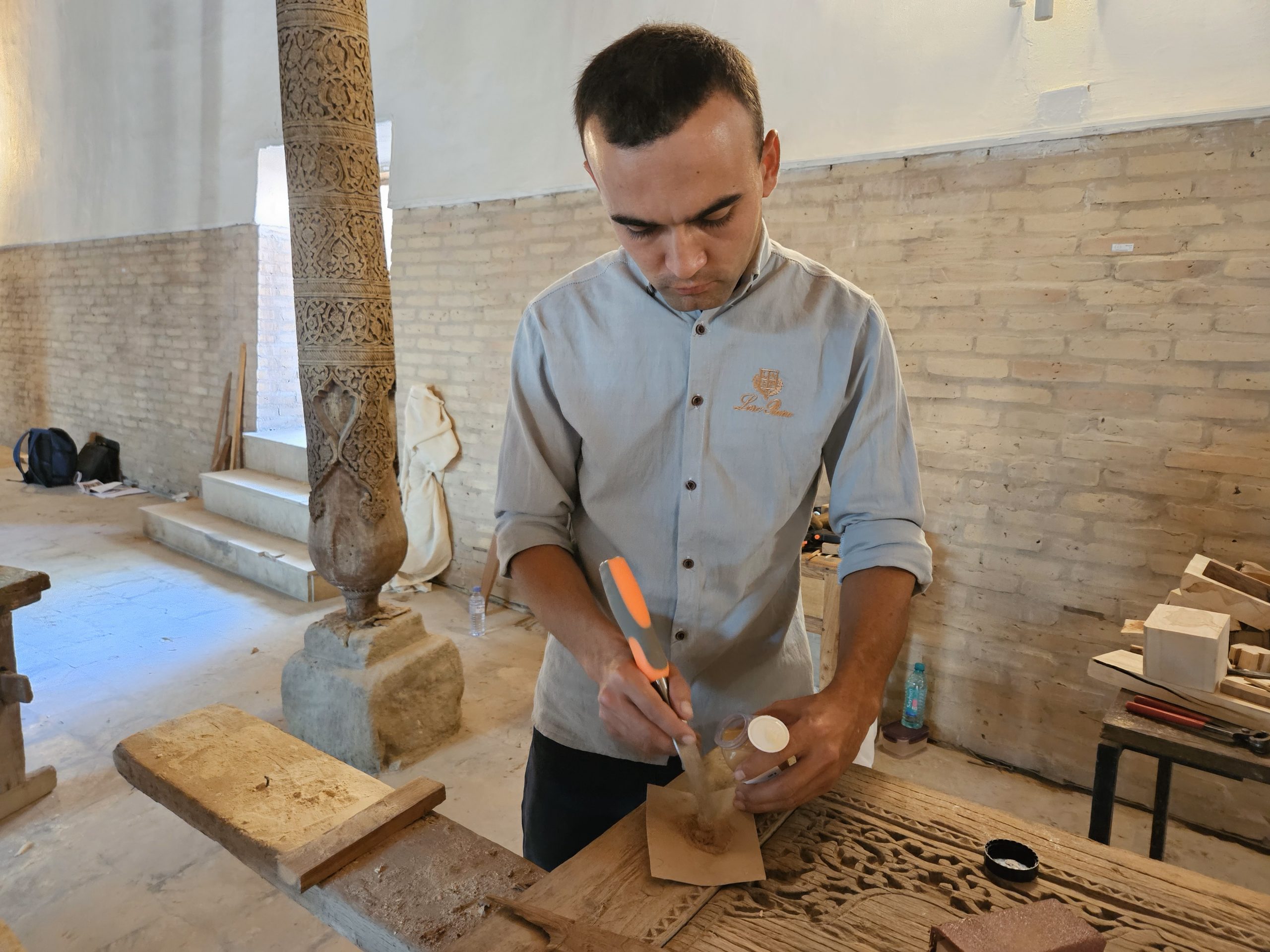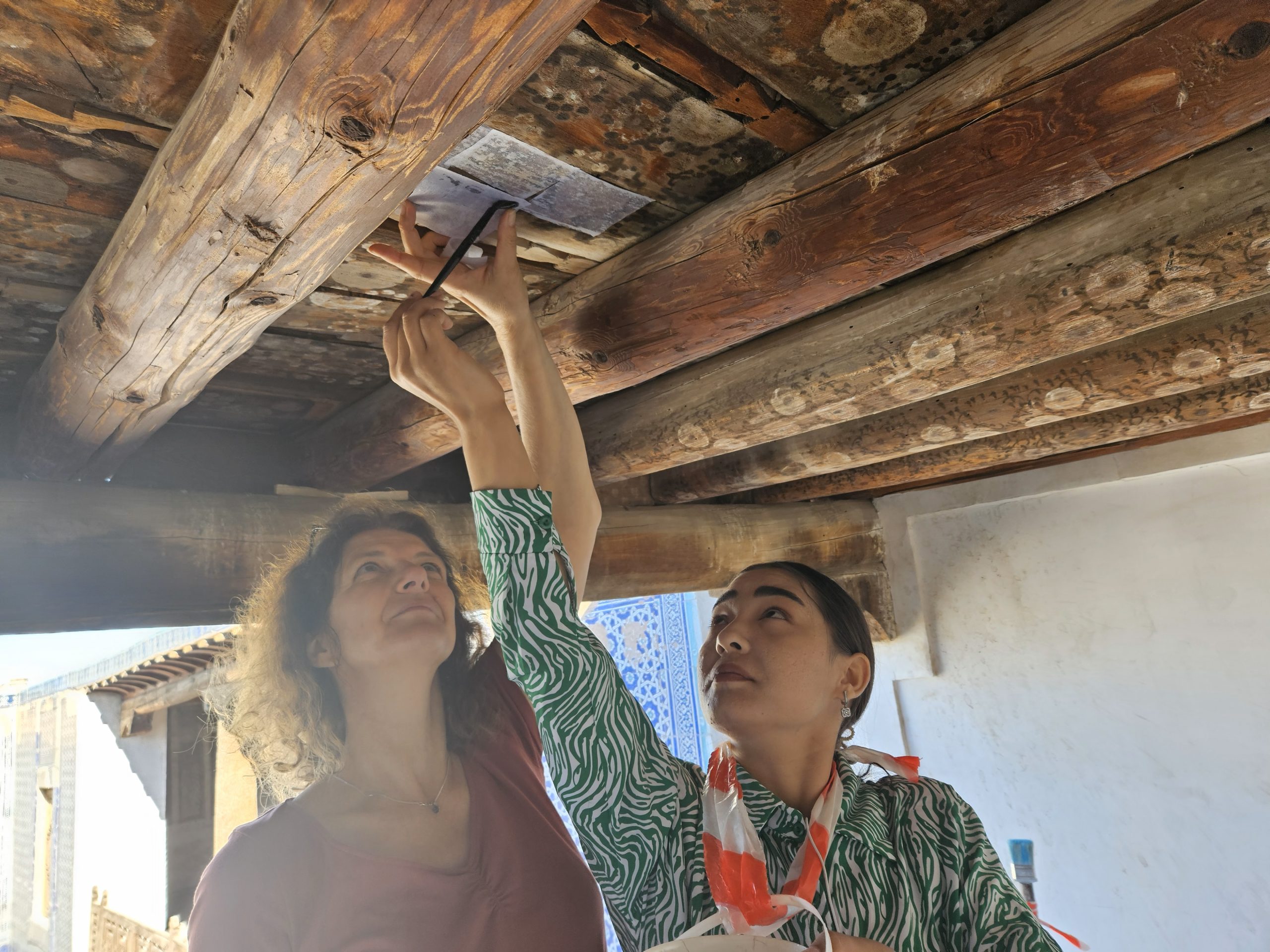 Die zweite Arbeitsgruppe restauriert die historischen Säulen und Sattelhölzer in Drachenform, verbunden mit der Deckenkonstruktion in der Juma Masjid in Chiwa. Fehlstellen werden ergänzt, Risse mittels Aussetzungen geschlossen.