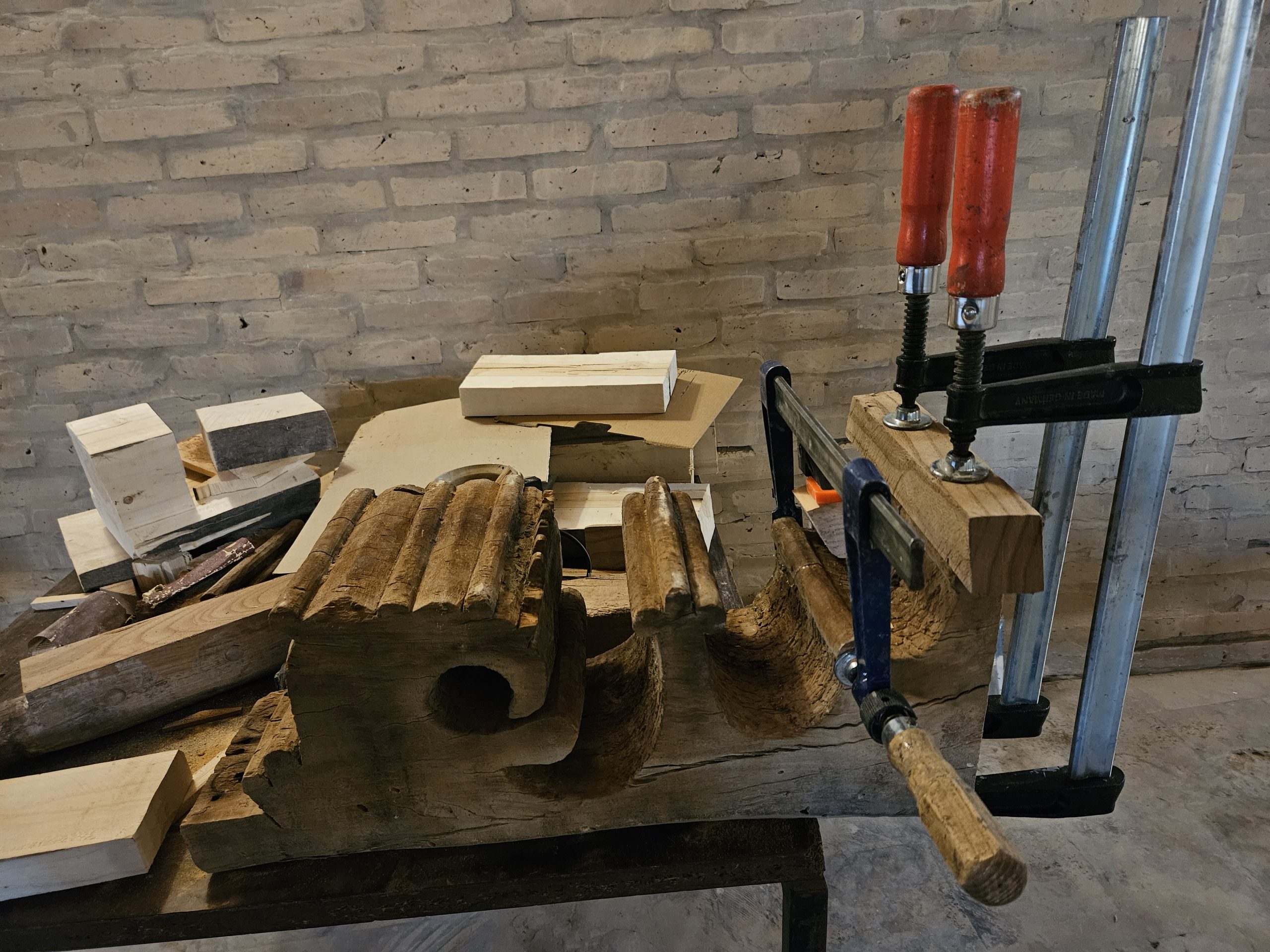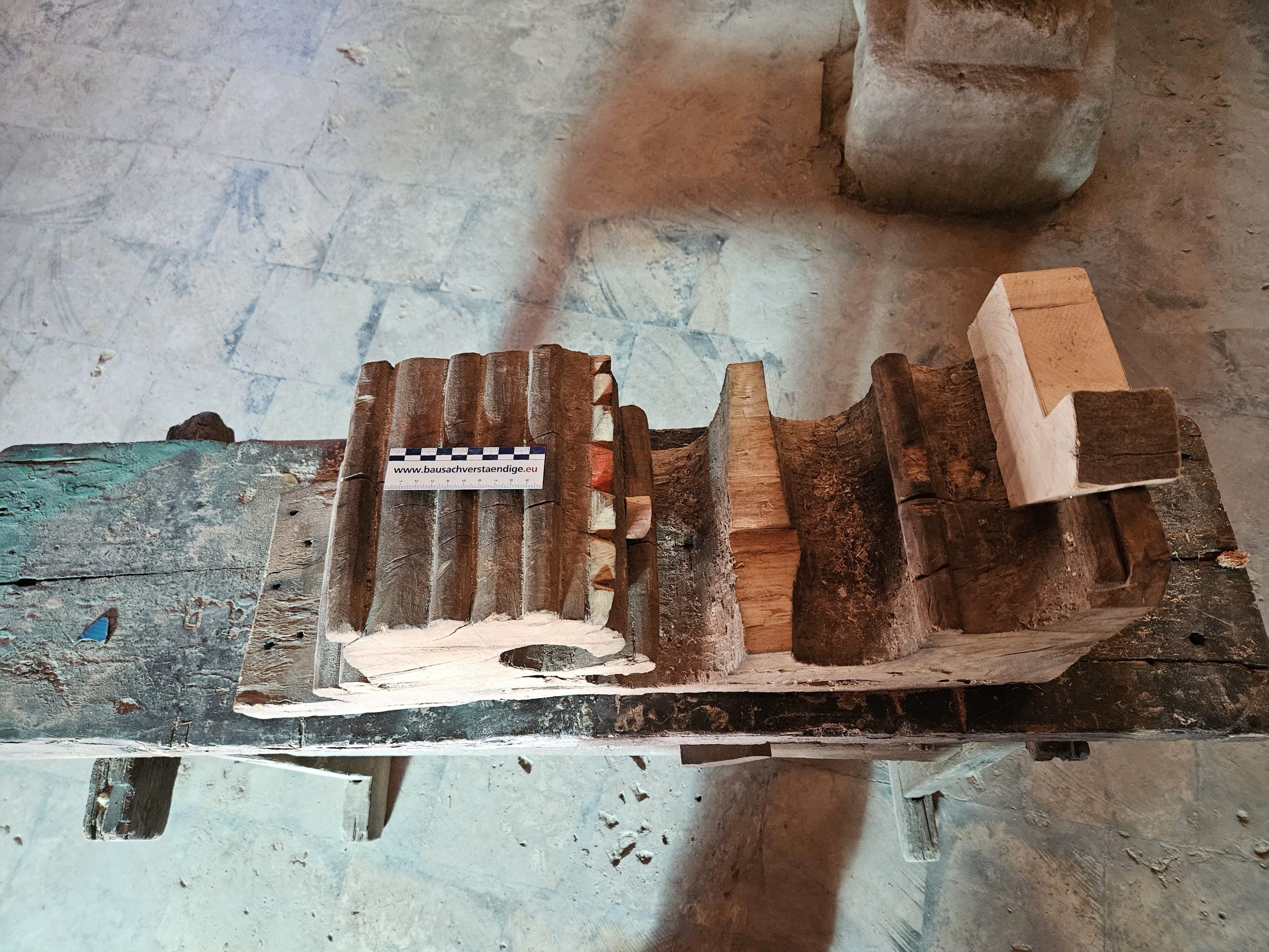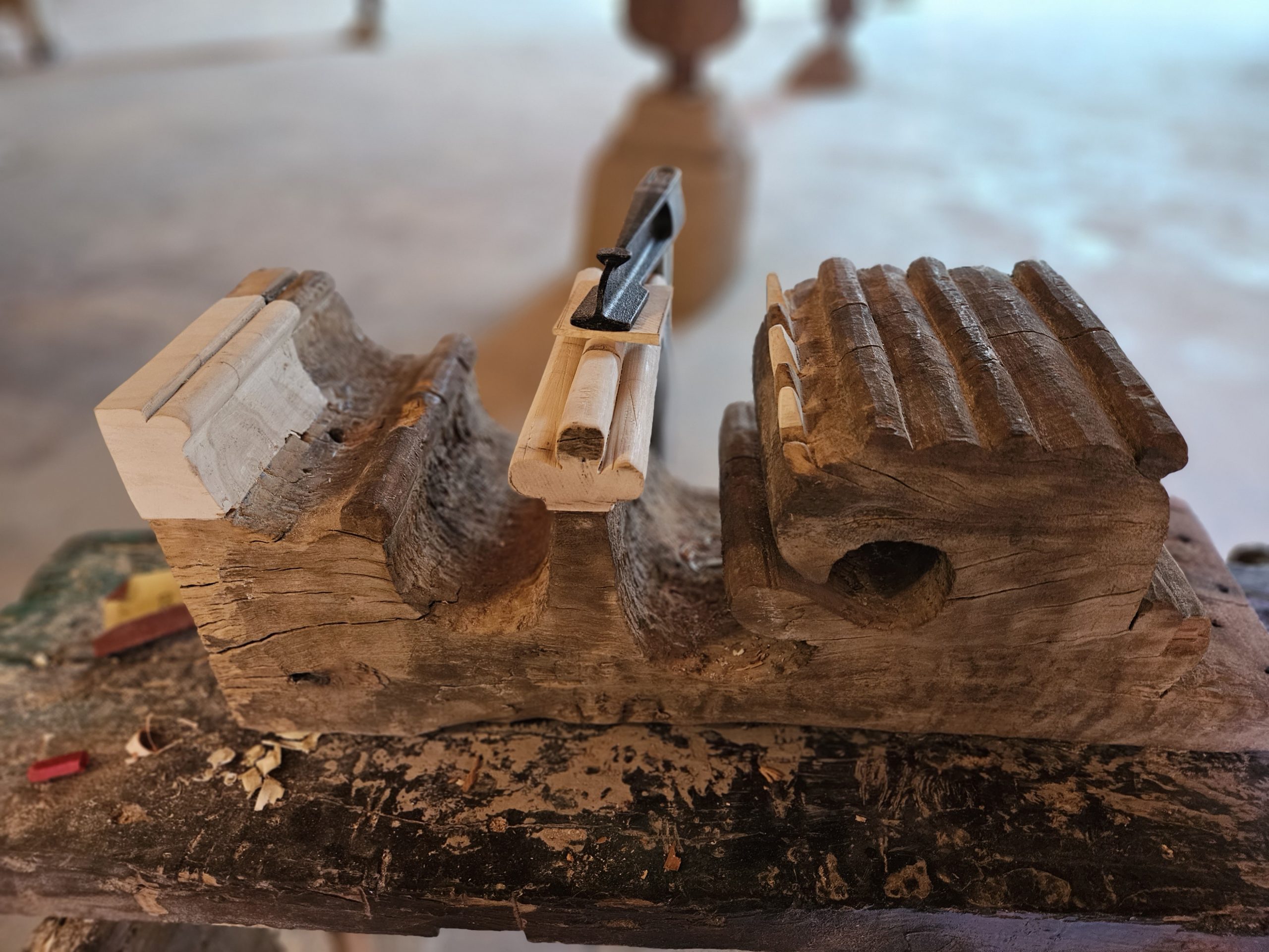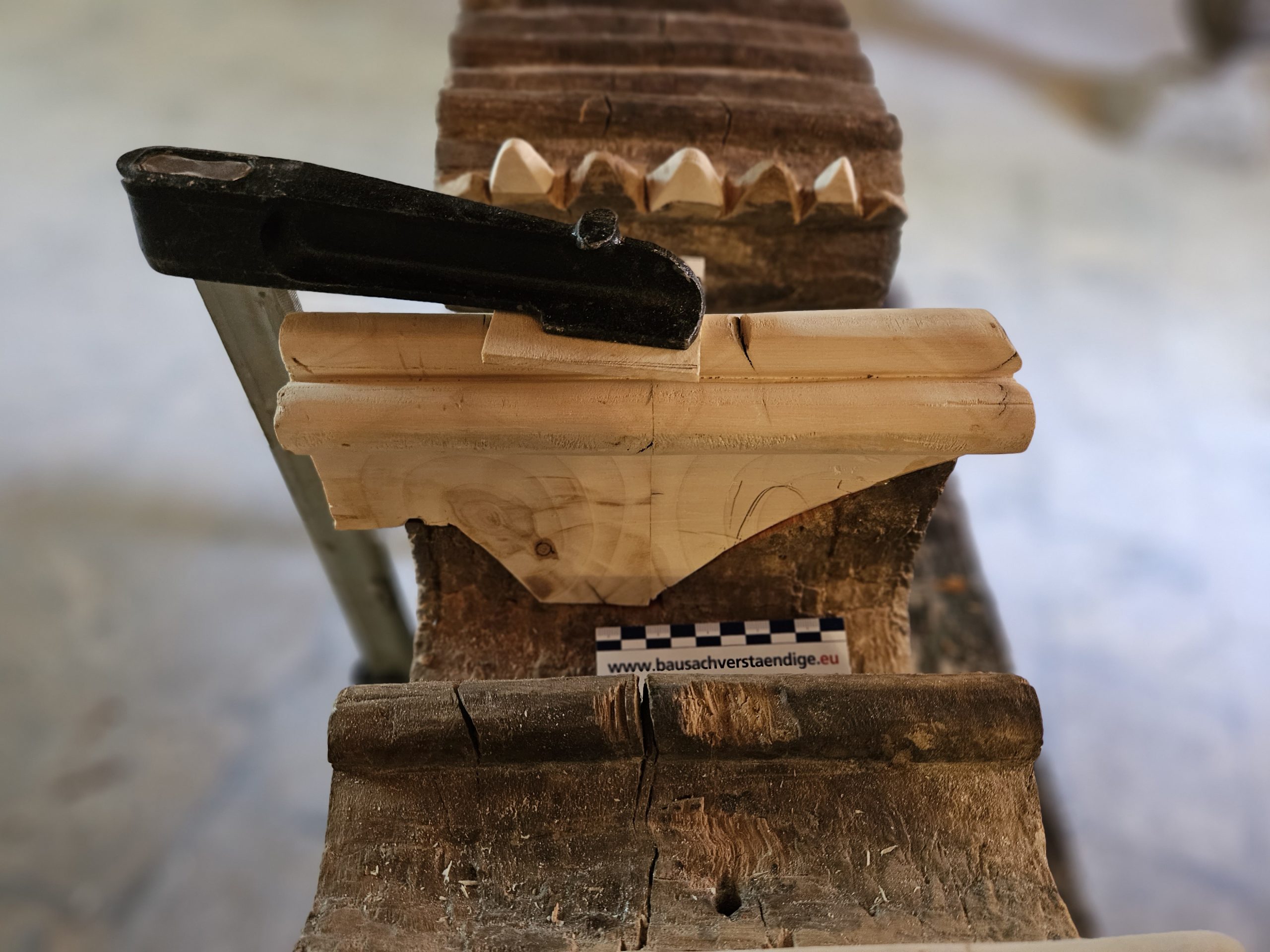 Restaurierung der historischen Säulen und Sattelhölzer in Drachenform.