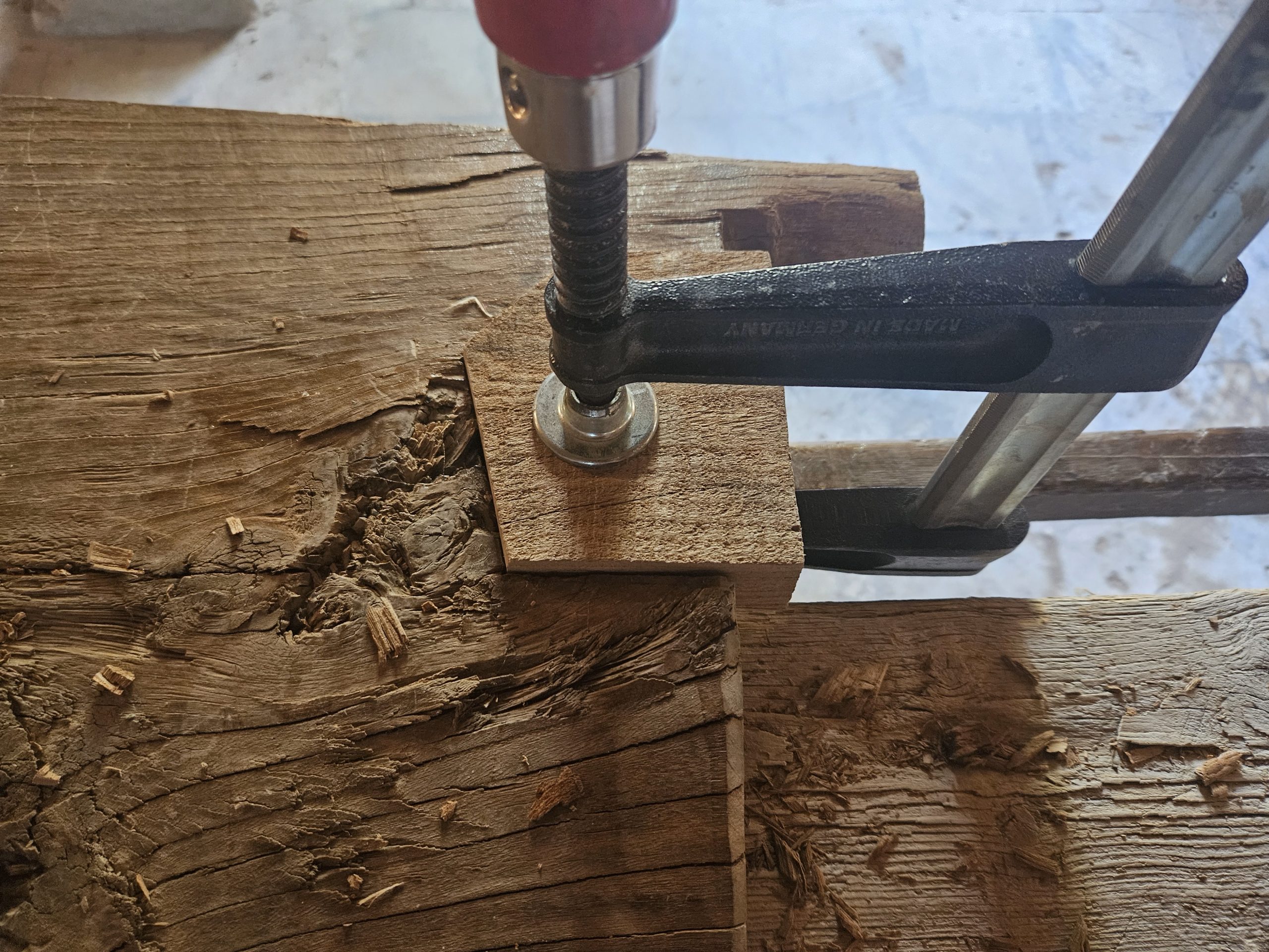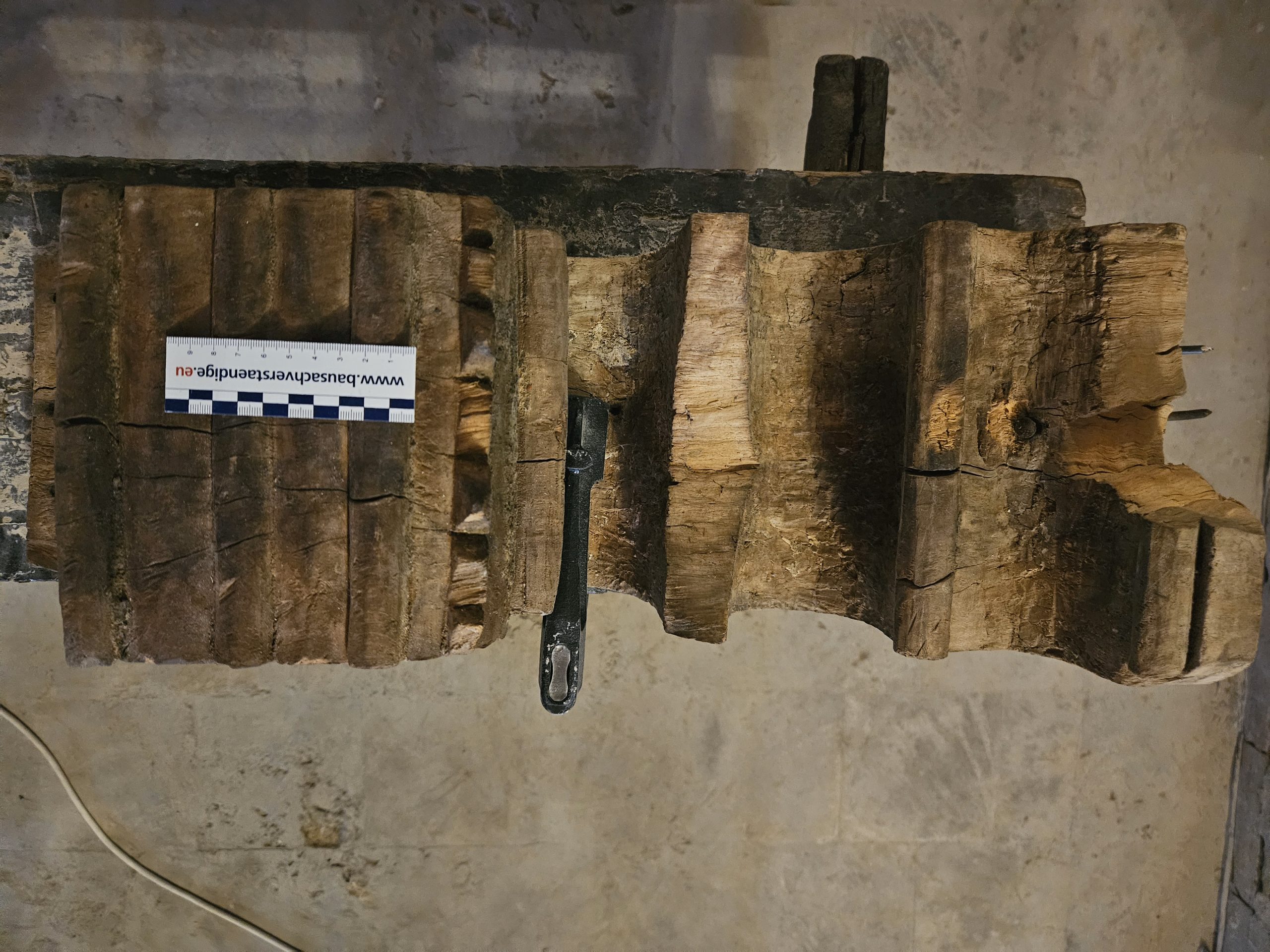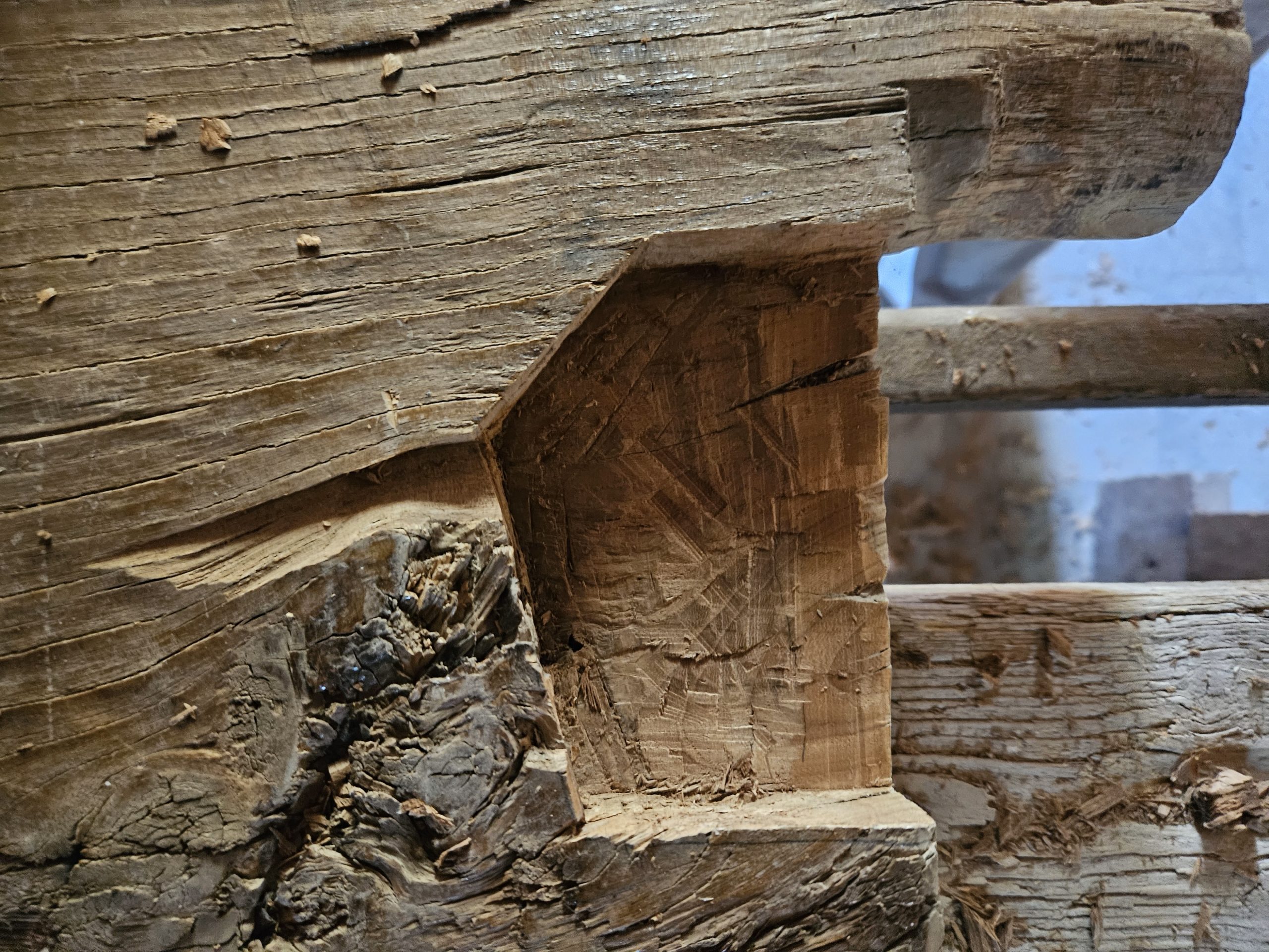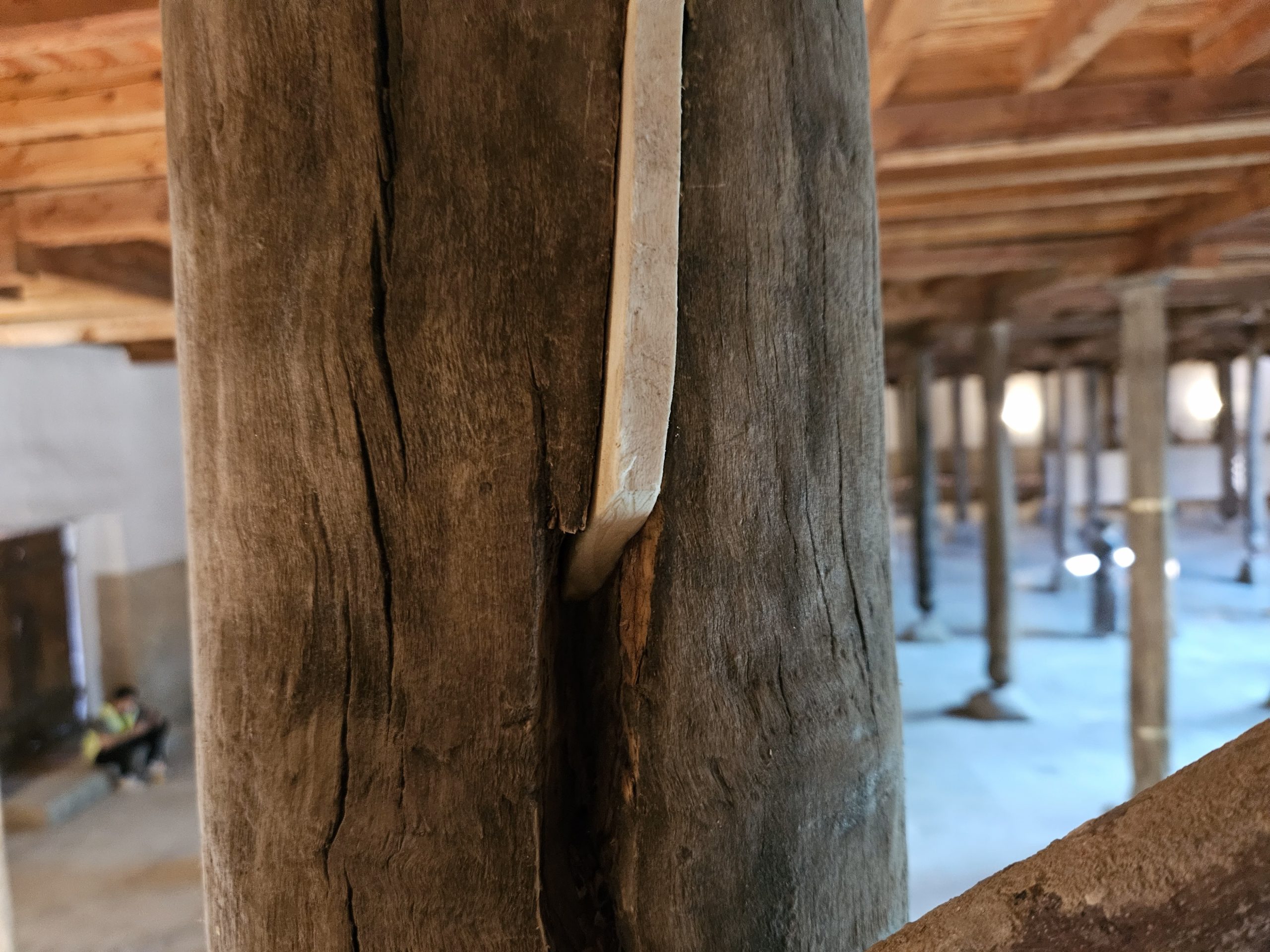 Restaurierung der historischen Säulen und Sattelhölzer in Drachenform.