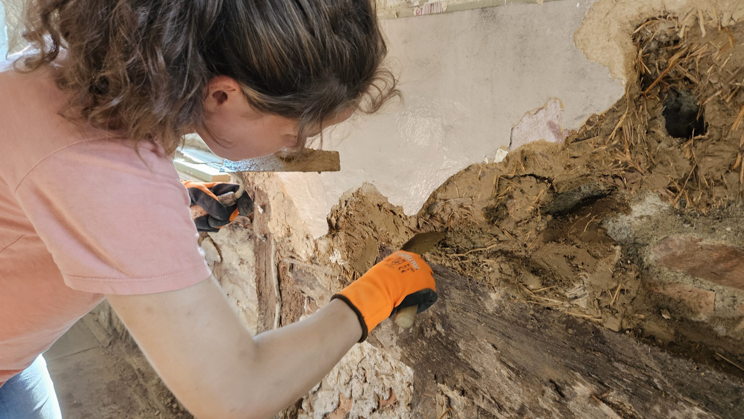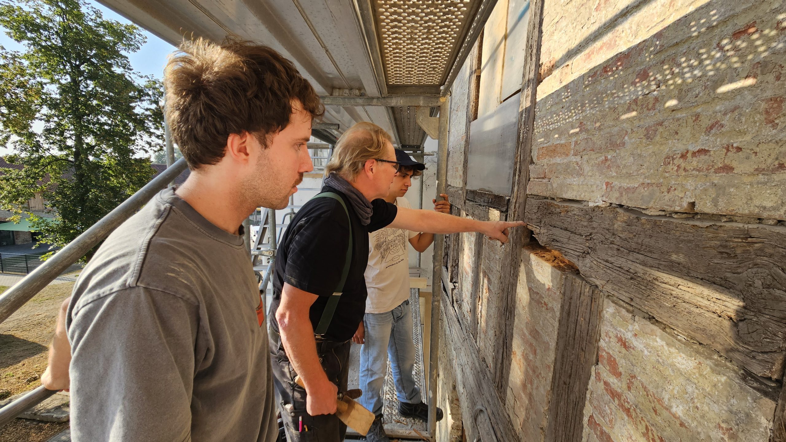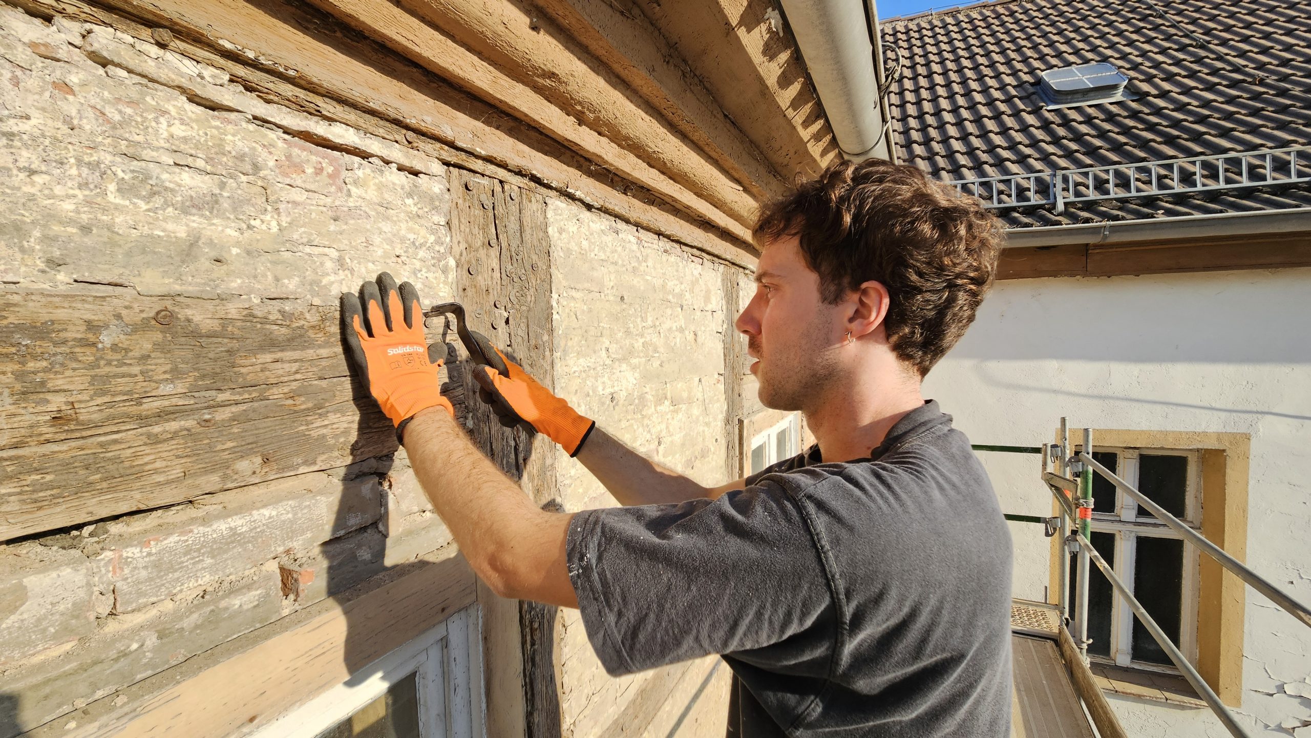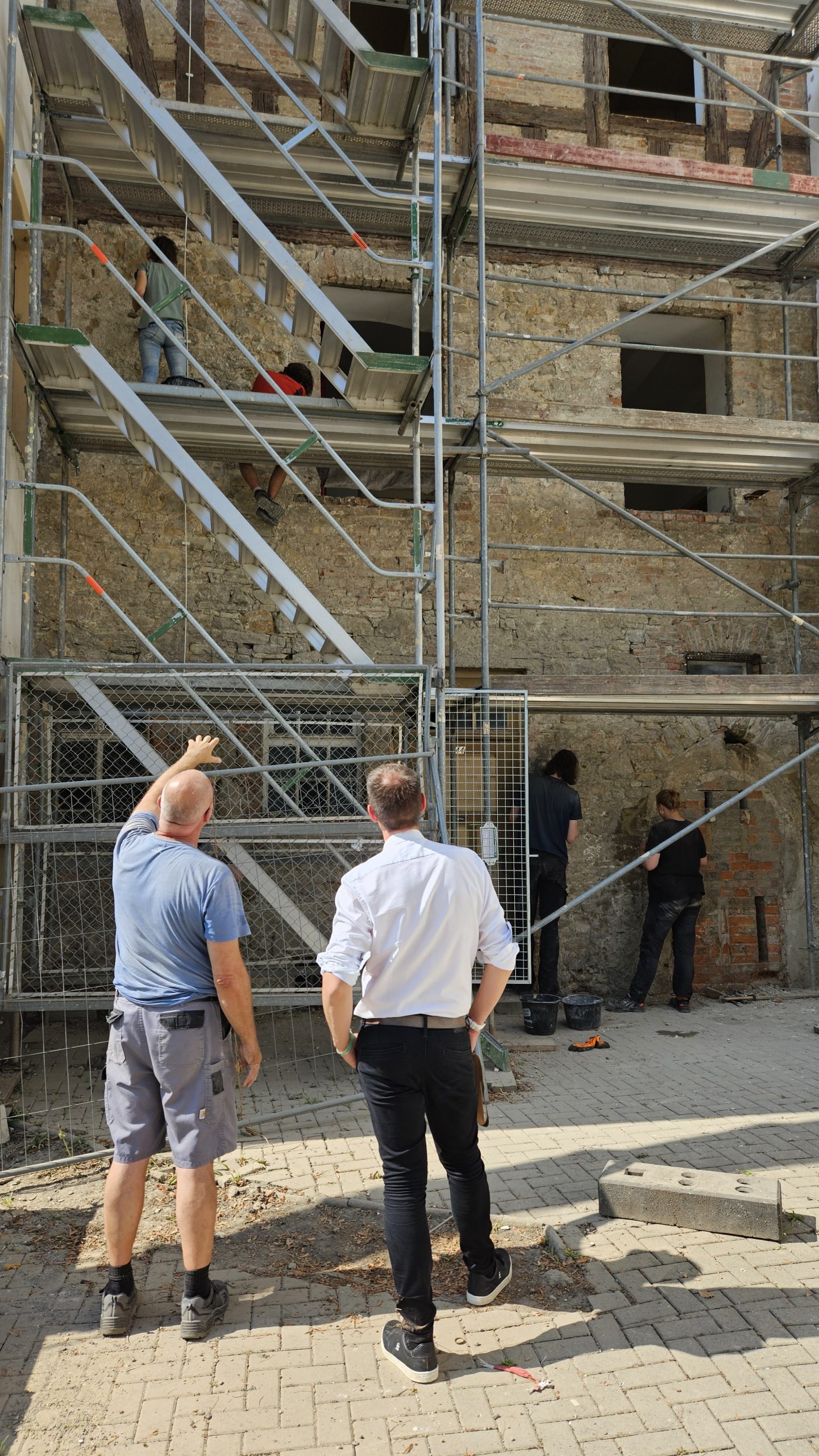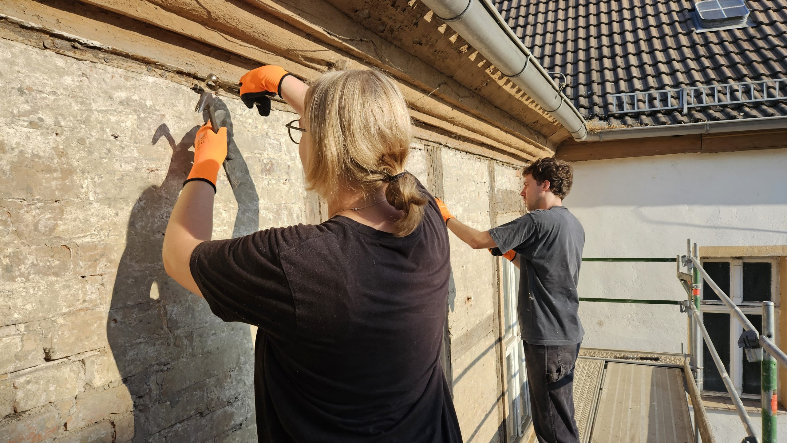 Die Student:innen aus dem gesamten Bundesgebiet nahmen mit ihrem Anleiter die jüngeren Zementputze an der Fassade ab. Die mittelalterliche Fassade mit Veränderungen in der Renaissance / Barockzeit zeigt viele Umbauphasen. Unter Anleitung wurden offene Fugen mit einem Kalkmörtel geschlossen und historische Putze und Fassungen kartiert.