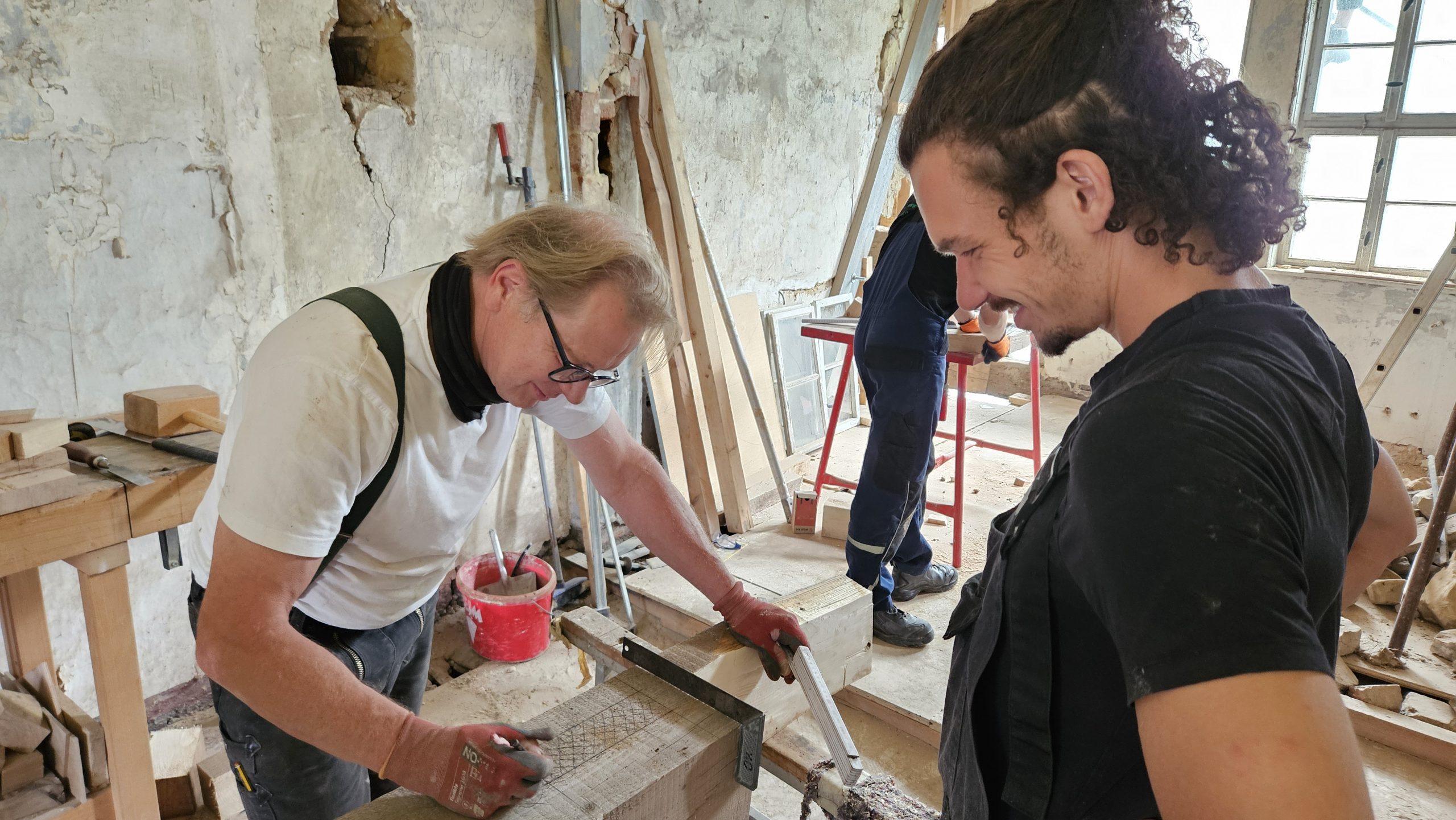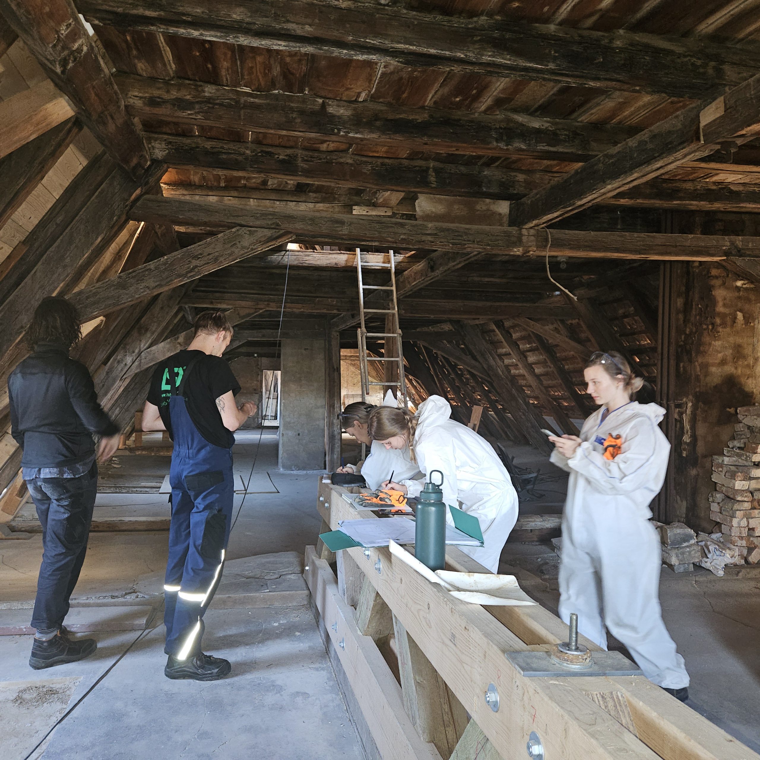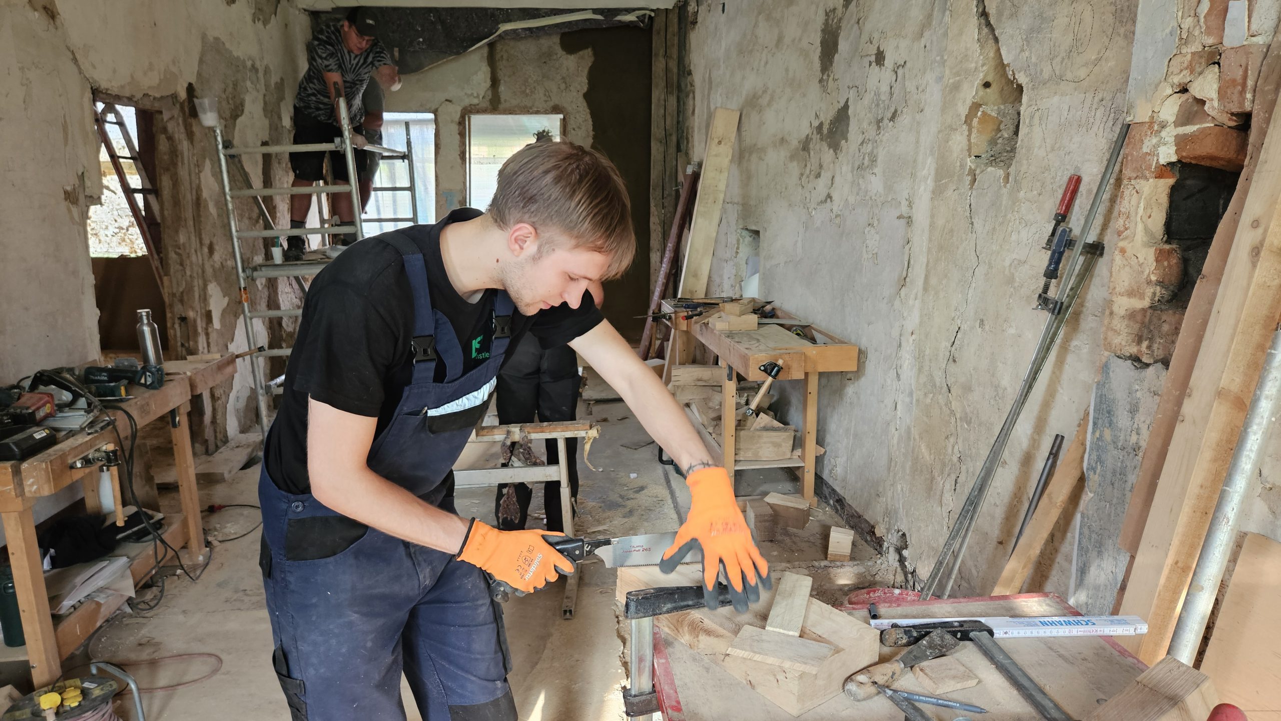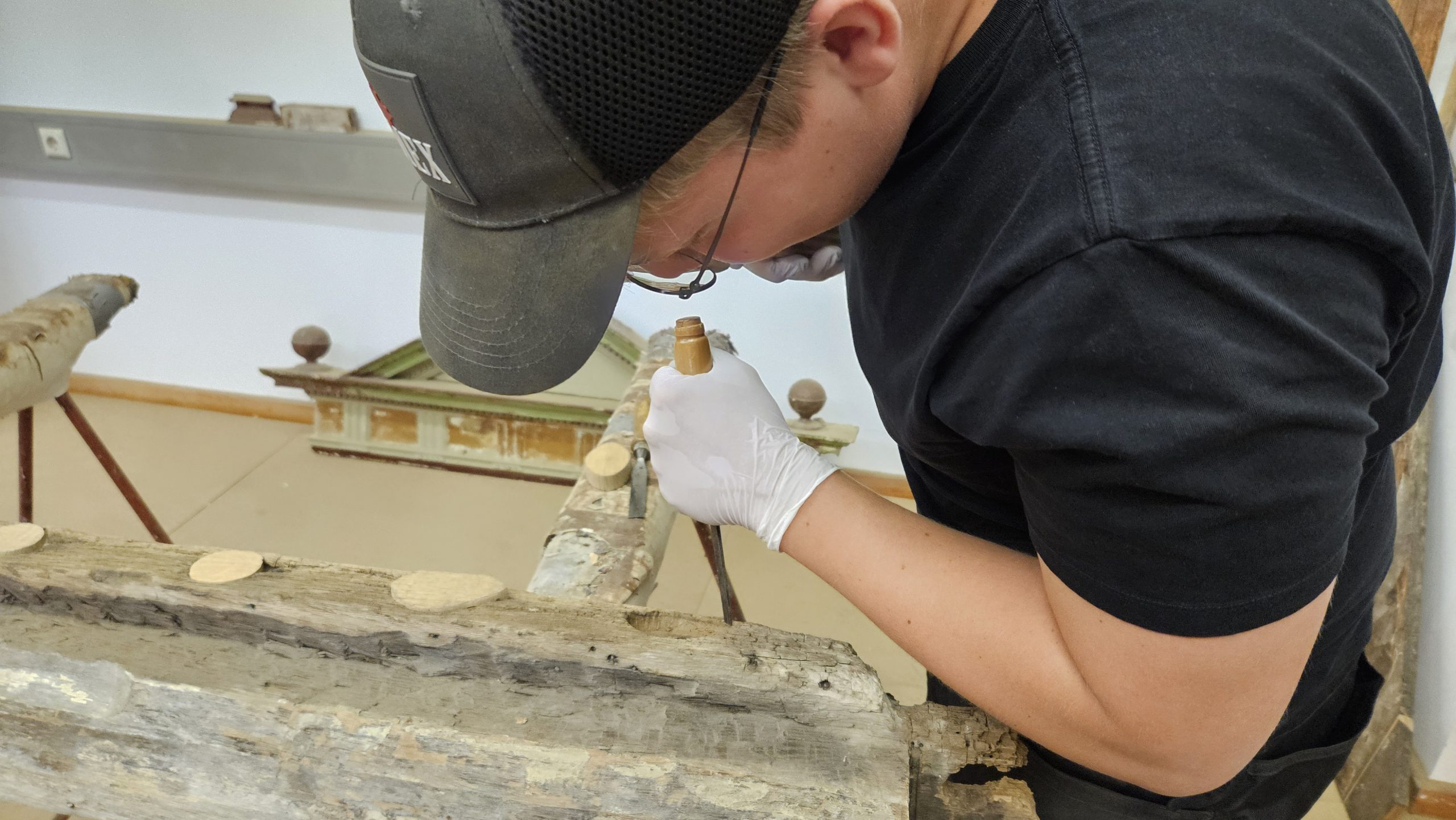 Gemeinsam restaurierten wir die Fachwerkkonstruktion des aus dem 16. Jahrhundert stammenden Adelshofes. Aussetzungsarbeiten starteten an den Streben, Riegel und Ständern, im Dachgeschoss wurden die Sparren, die liegende Stuhlsäule und der Deckenbalken des Daches aus der Renaissance restauriert.