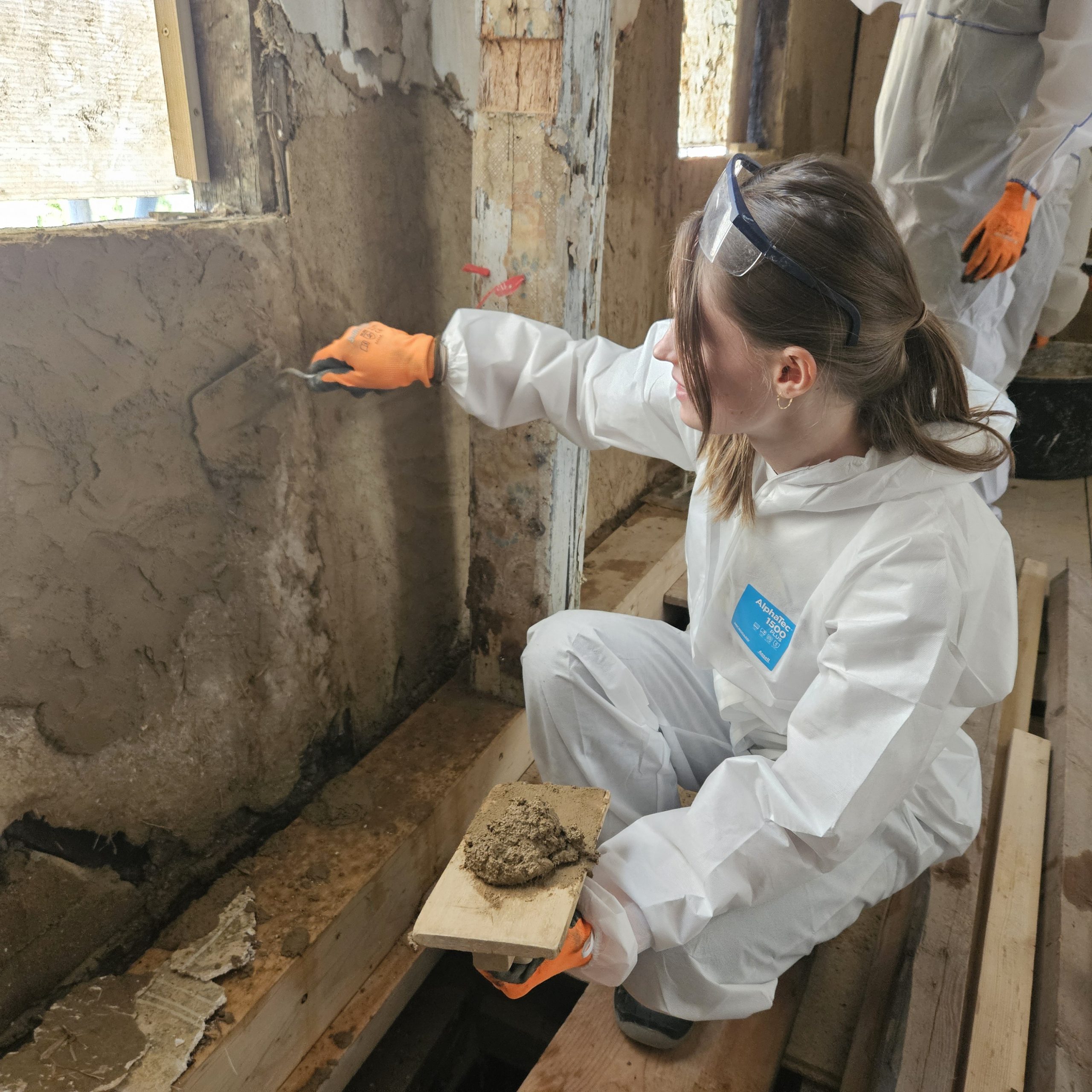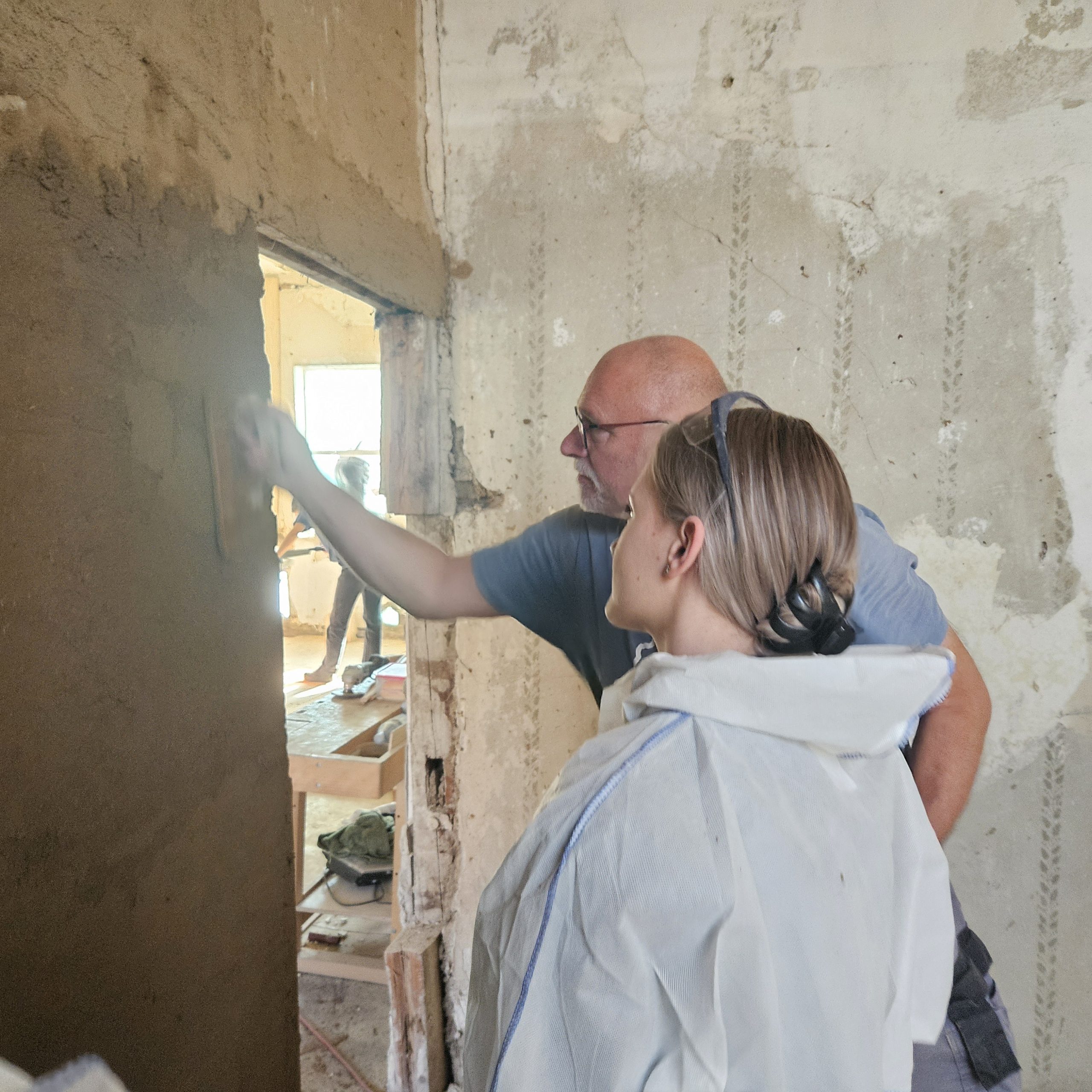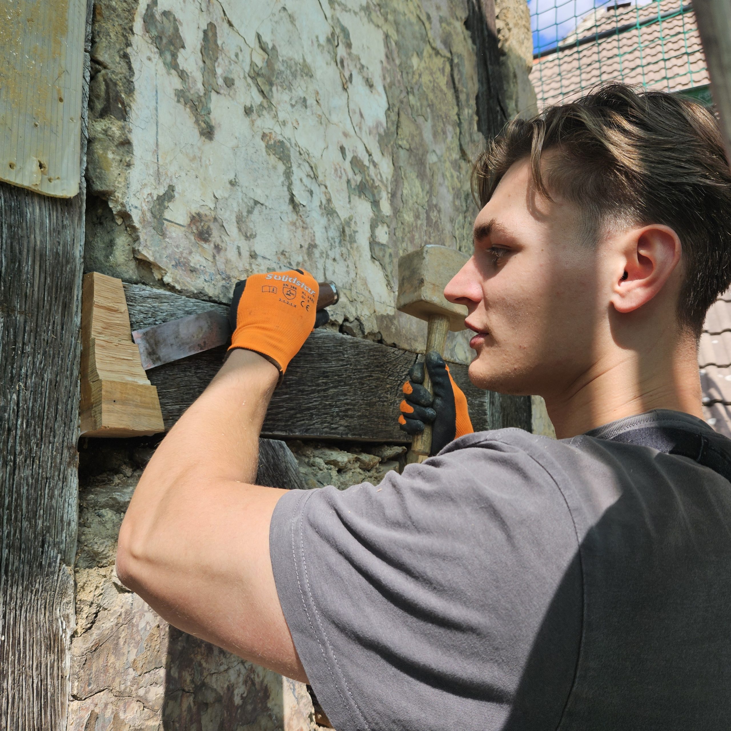 Gemeinsam restaurierten wir die Putze des aus dem 16. Jahrhundert stammenden Adelshofes. Aussetzungsarbeiten in den historischen Putzen starteten mit der Entfernung jüngerer Putze und dem Ausfüllen der Fehlstellen mit Lehm- und Kalkputzen.
