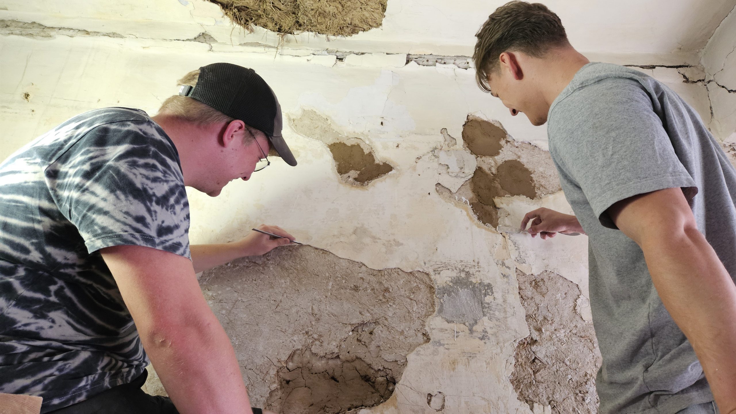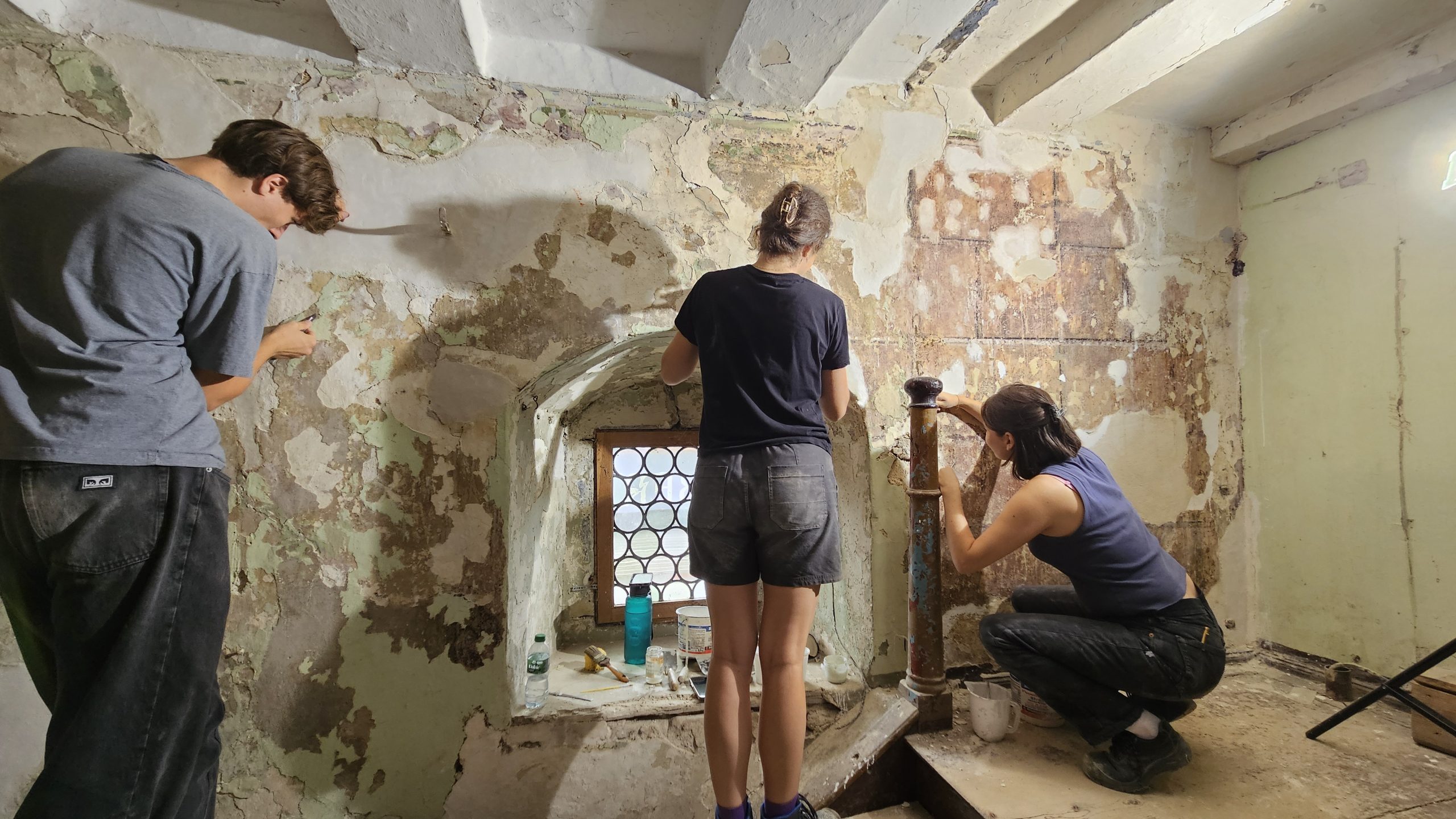Replacement work in the historic plasters began with the removal of younger plasters and the filling of the gaps with clay and lime plaster.